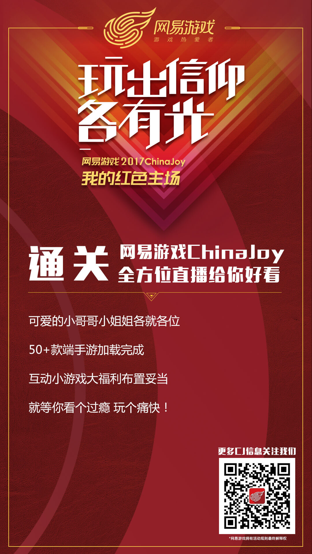 今天,一年一度的游戏界盛会ChinaJoy就正式在上海拉开帷幕。虽然话题点众多,但是玩家最关心的其实还是游戏本身。恰逢今年是网易20周年,外界也纷纷猜测,网易游戏是否会趁势发大招,在ChinaJoy上带来一些新玩意。而今天,就让咱们提前走进这个约1000平米的网易游戏红色主场,去近距离看看这支红色军团吧! 50+精品游戏同场亮相,端手游PK不断 作为国内超一线游戏厂商,网易游戏这次ChinaJoy之旅,也不出意外地派出了一支“游戏天团”。在这支包含了50多款网易人气游戏和数款网易产品的“天团”中,不乏像《梦幻西游》、《大话西游》、《倩女幽魂》、《天下》这样的经典IP,也有像《阴阳师》、《率土之滨》等移动互联网市场中崛起的新锐,更有《我的世界》中国版精彩亮相。 除此之外,还有众多新品将出现在ChinaJoy现场,比如网易首款对战卡牌游戏《秘境对决》、开放式3D战争手游《战国志》以及网易首款团队狩猎手游《猎魂觉醒》等重磅新品。在整个ChinaJoy期间,它们将在网易约1000平米超大展台上,为玩家奉献超过50场次现场表演以及端手游同台PK竞赛。相信每一个网易游戏热爱者,都能在其中找到自己所喜爱的游戏。 张碧晨暖心助阵,高颜值Coser&Showgirl邀你来玩 对于特地前来ChinaJoy欣赏美少女的玩家,网易游戏也为其准备了满满的视觉福利。在整个ChinaJoy期间,网易游戏特别邀请了诸多美少女和美少年,变身coser和showgirl与玩家进行趣味互动。他们或在合影区,邀请玩家前来合影留念,或身处试玩区,化身高玩,指导玩家体验网易游戏,或在主舞台上,与玩家一同体验各种游戏环节,并为玩家送上丰厚游戏好礼。除此之外,知名灵魂歌手张碧晨也将化身“信仰吟游人”,为网易游戏ChinaJoy的玩家送上祝福。 福利多多,定制专属周边免费送 除了有丰富精彩的游戏节目和大牌嘉宾加持外,网易游戏还将为玩家在ChinaJoy现场送上诸多专属游戏周边好礼。其中不仅包含了网易游戏诸多经典游戏元素的首款玩家面具、极具个性的首款头上立FLAG、各种游戏公仔和抱枕。还有网易游戏与华为、雷蛇、haze、舒克等一线品牌合作推出的跨界好礼。 除此之外,网易严选和网易考拉也将在现场,派发能让人在瞬间满血复活的定制版波子汽水和零食大礼包!而网易游戏的奇遇俱乐部还把人体娃娃机搬到了现场,为玩家抓取包括金钞在内的高额好礼。只要关注网易游戏展台,参与各种互动游戏,就能将这些周边好礼打包回家哦~ 线上同嗨,大咖主播带你飞 在线下狂欢的同时,别忘了网易游戏在线上也将延续这份精彩。在ChinaJoy期间,网易游戏将通过微信公众号(账号:netease-game)等平台,与玩家分享千人千面的游戏故事,走进每个人不同的游戏人生。 此外,网易游戏还将以直播的形式,携手CC直播主播Angel、斗鱼直播主播菠萝毛、龙珠直播主播水冰月、bilibili直播主播桜嵐karu等,为无法前往现场的玩家,一线展示ChinaJoy盛况。锁定下方直播时间表,大咖主播带你一秒穿越红色主场,感受网易游戏的魅力! 更多精彩关注网易游戏2017ChinaJoy专题网站: http://game.163.com/m/2017/chinajoy/ http://game.163.com/2017/chinajoy/ |