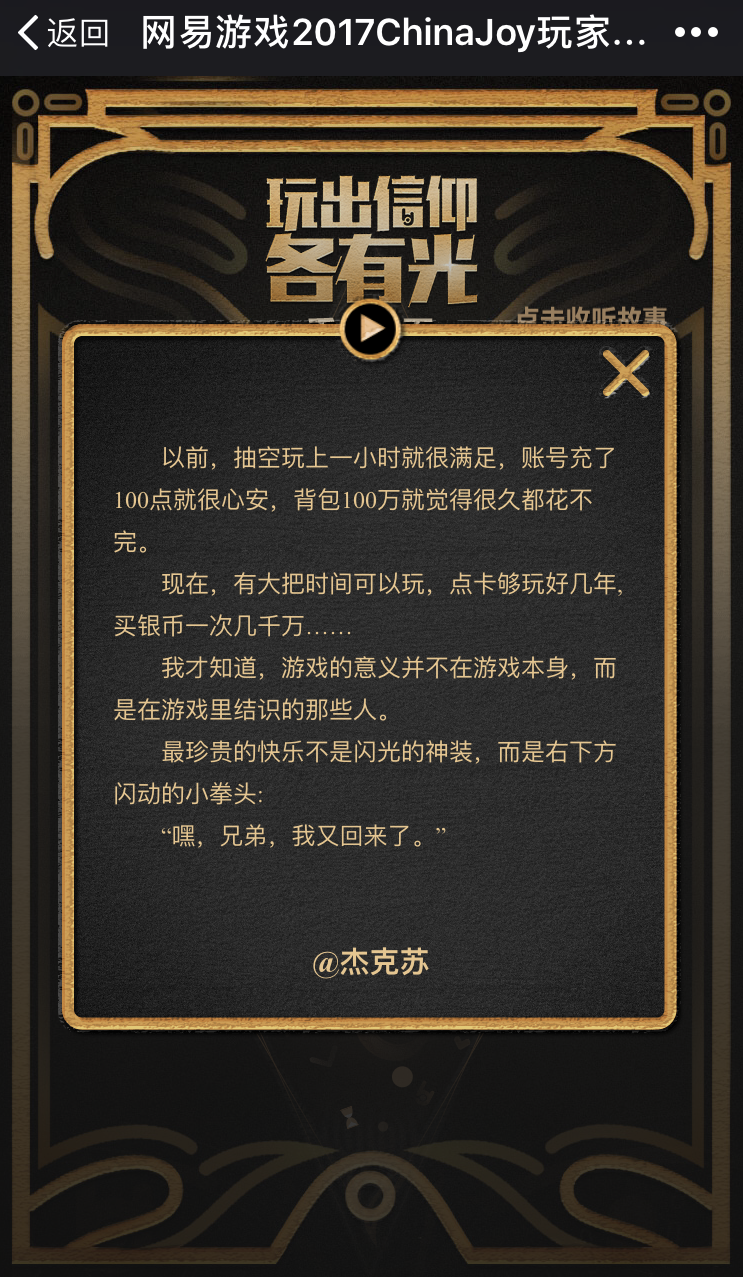 2017年ChinaJoy的第一天又让我们看到了游戏的巨大能量。一如既往忍受着烈日的长队,耐心等待着游戏试玩的玩家们,还有展馆各个角落瘫着休息的那些面孔。 游戏的热爱,在这里集中释放。 我们经常好奇,为什么一款游戏,可以坚持几年、十几年? 精致的画面、引人入胜的故事、丰富的玩法、不断推出的更新……除此之外,还能有效抵抗审美疲劳的,或许还是人与人之间的情感和社交。 游戏这个世界是虚幻的,但游戏中人与人的互动,却是真实的。最近,网易游戏在2017年ChinaJoy,用12个温暖的声音讲述了12个动人的游戏片段。正如今年网易游戏ChinaJoy主题“玩出信仰,各有光——千人千面,我的红色主场”所言——千人千面,大概就是1000个玩家,就有1000个爱上游戏的理由。 兄弟:“别玩了,快去休息吧,明天加油!” 几乎每一个玩家,在游戏中都曾经经历过感动,对于玩家@奇葩 而言,即便是陌生人,也曾经给过他最难忘的回忆: 去年夏天的高考前夜,我心情烦乱,上线放松。 进了一个抓鬼队,和大家边打边聊。 突然队长问:“有没有明天高考的啊?” 我说:“我就是~” 队里突然安静了。然后队长丢了我200w! 正奇怪,他们说:“别玩了,快去休息吧,明天加油!” 心里一暖,瞬间就有了力量。 爱情:“左传也来了哦” 而对于@左传他爹 而言,游戏则是他爱情的见证者: 04年我们初见,我叫“左左”、她叫“莫莫”。 05年她转区,我把她追回,我叫“左左回来了哦”,她叫“莫莫回来了哦”。 08年我们结婚,重启梦幻,我改名“左左又来了哦”,她叫“莫莫又来了哦”。 今年孩子上学了,估计过不了多久,“左传也来了哦”…… 陪伴:“当初只是想有一个借口来保护你,如今不需要了” 在玩家@李庆新 看来,游戏则是一个守护自己所爱之人的地方: 我喜欢的她,被别人求婚成功了。我只好做她哥哥,每天带她抓鬼杀地煞。 直到有一天,她和游戏里的老公分开,我对她说了很多想说已久的话。 她一脸嫌弃,说哪有哥哥向妹妹求婚的。 我说,当初只是想有一个借口来保护你,如今不需要了。 据说当时她哭花了妆。后来,我们就在一起了。 乐趣:“帮战请个假” 对于玩家@银行大亨 来说,在他的游戏生涯中,他所认为的最强大的人,是一个准妈妈: 游戏里遇到的印象最深的人,是一个健谈的准妈妈。 有天不知不觉聊了一下午,到快要帮战的时候,她云淡风轻地来了句: “帮战请个假,我羊水破了,现在准备去医院了……” 帮里的伙伴都惊呆了! 各种紧张、关心,劝她快去医院…她还若无其事地跟我们说说笑笑…… 这些属于玩家自己的故事,组成了一个个游戏小社会,也成为了无数玩家热爱游戏的理由。 H5在社交媒体上发布后,也有不少玩家写下了自己的感悟: @小嚣张:我自己在玩一个几乎没有什么社交功能的游戏,那天我要高考了,于是改名叫“高考一个月勿删”。一个月后,我上了游戏,不仅没有好友删我,而且还有不少朋友改名叫了“高考加油”,明明我根本不认识他们,也没有什么互动,但是那一刻我真的被感动了。 @美米真的没米了:再好的游戏总有一天都会腻,我们留在游戏的理由,只是因为TA在游戏里。 @某雷:谢谢游戏,让我认识到了很多以前根本不可能认识到的人。 这些简短的玩家故事,或许能让不少人看到自己的影子。在网易游戏2017ChinaJoy上,“玩出信仰,各有光——千人千面,我的红色主场”这一带着些许情怀的主题,再一次将聚光灯交给了屏幕背后的玩家。在ChinaJoy这个属于玩家的主场,网易游戏是否将带来更多热爱的理由? |
