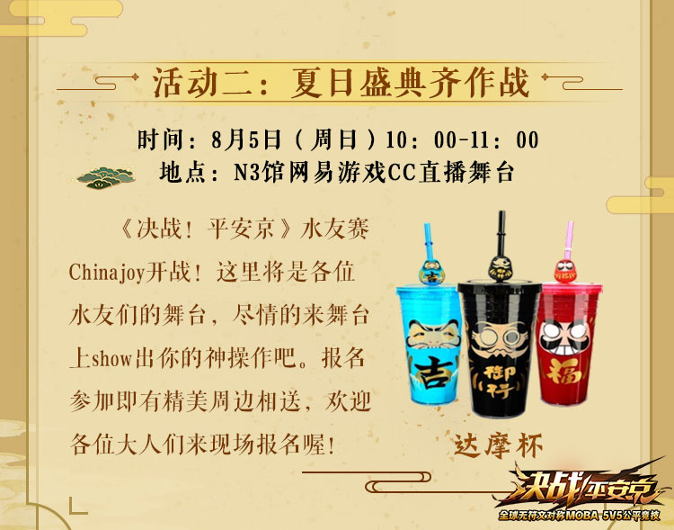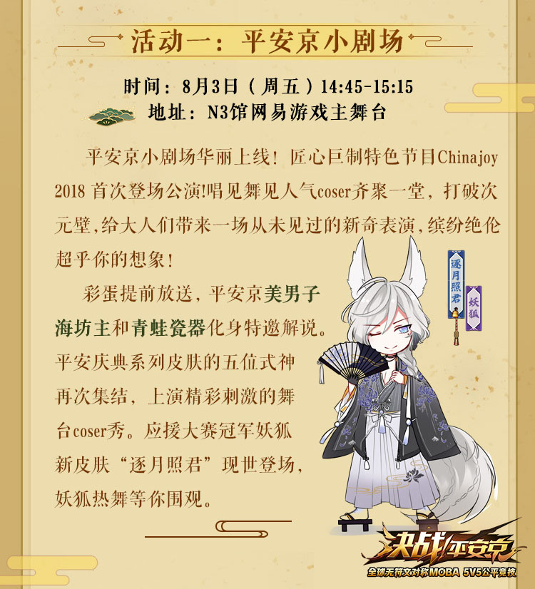 魑魅魍魉,集结魔都。8月3日至8月6日,一年一度的ChinaJoy即将在上海盛大举行,《决战!平安京》也将在此次展会中惊艳亮相。平安京小剧场华丽上线,超人气唱见舞见coser齐聚一堂,平安庆典系列皮肤的五位式神也将再次集结,更有逐月照君——妖狐热舞登场,就让我们一起相约上海新国际博览中心N3馆网易游戏展台,不见不散哦! 决战平安京参展ChinaJoy,盛夏看点一网打尽 盛夏八月,《决战!平安京》首次出征ChinaJoy,为广大阴阳师大人们带来精彩纷呈的华美盛宴,同时还有各种丰厚好礼等待着大人们来赢取! Chinajoy是全球泛娱乐领域极具影响力的年度盛会,《决战!平安京》在本届CJ中准备了许多丰富有趣的线下活动及表演,与大人们共度盛夏狂欢。8月3日14:45-15:15期间,《决战!平安京》精心筹备的特色节目——平安京小剧场将在ChinaJoy上首次登场公唱!唱见、舞见、人气coser都将齐聚N3馆网易游戏主舞台,以绝伦之姿为大人们带来一场超乎想象的新奇表演。 此外,平安京美男子海坊主和青蛙瓷器还将化身特邀解说,带领玩家们畅游平安京CJ现场,揭秘大大们背后的趣味秘闻! 另外,曾在BW2018惊艳亮相的平安庆典系列皮肤的五位高颜值式神——白狼、鬼使黑、山兔、大天狗、雪女,也将再次集结而来,上演精彩刺激的舞台coser秀!同时,红白应援大会冠军妖狐也将身着新皮肤“逐月照君”现世登场,他的华丽热舞又怎能错过? 有了盛世美颜一饱眼福,自然也少不了线下对战来畅享欢乐。8月5日10:00-11:00,玩家们可前往N3馆网易游戏CC直播舞台,与线下水友战激情开战,尽情秀出自己的过人操作,享受夏日盛典的热闹。报名参加即可赢取达摩杯等精美周边,欢迎大人们前来体验! 活动详情: ChinaJoy 2018 活动时间:2018年8月3日-8月6日 活动地点:上海新国际博览中心 展位信息:N3馆网易游戏-决战平安京展位 夏日盛典,相约上海。8月3日至8月6日,《决战!平安京》携手人气唱见舞见coser参战ChinaJoy,精彩节目今日曝光,丰富活动给你惊喜!更多精彩内容,更全活动预告,请关注《决战!平安京》官方网站、官方微信。 【关于《决战!平安京》】 《决战!平安京》是一款全球无符文对称MOBA手游,秉承 5V5公平竞技理念,告别符文系统,实现了地图镜像对称、战斗数值均衡,真正绿色公平对战;继承网易重磅IP《阴阳师》,和风画面细腻唯美、人气式神接连登场、顶级声优鼎力加持;独特有趣的技能设定和自由搭配的“阴阳术”,带来更多的技能组合和战术变化,为玩家带来全面革新的MOBA手游体验! |