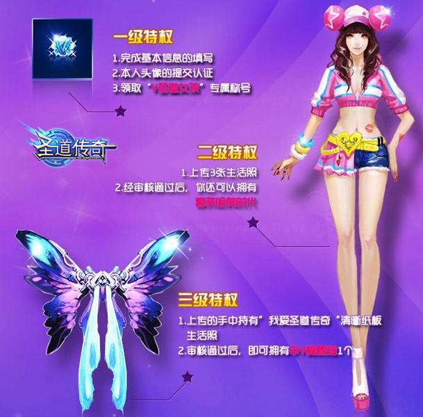 【申V特权 女孩福利享不停】 《圣道传奇》启用首创的申V系统,让万千宠爱集MM一身,让美女能够享受到各种特权。女性玩家只要通过官方的团队获得认证,证明自己是100%的MM,账号下所有女性角色都可以享受到游戏中各种特权。得到认证的女性玩家将获得包括3倍经验在内的特权大礼包、特权专属时装、以及独特的专属称号等各种奖励。 申V一共分为两个等级,各对应不同的虚拟奖励。女性玩家只需通过官方的特定页面提交基本信息及自己的头像即可得到1级申V认证,凡是通过特定页面提交三张生活照片的,将成为2级申V特权用户,MM玩家将可以得到更多的奖励。 只要你是MM,就可以参与申V,3分钟完成,简单方便,好处颇丰。更有哈韩粉红套装和奢华紫色翅膀让你证明身份!《圣道传奇》打造ladyfirst的首创概念,给予游戏美眉充分的关爱、至高的权益、极大的便利。