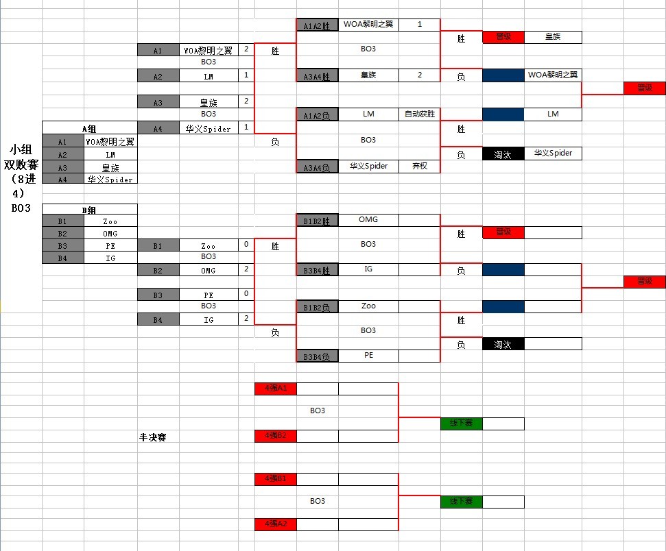 第三场: 开场B/P方面,Royal Ban掉凯尔、石头人、慎,选择了螳螂、索拉卡、豹女、杰斯和蜘蛛;WOA Ban掉了卡萨丁、兰博、鳄鱼,并选择了皇子、琴女、拉克丝、女警和狗熊。 开局双方抱团准备一级团,可惜各走一边,之后双方各自上线,豹女抢到了蓝BUFF。上单狗熊凭借精彩操作,一套连招拿到一血。13分10秒双方抢蓝BUFF,琴女直接放大秒掉了蜘蛛,Royal只得撤退,人头0比2WOA领先。经济上Royal却稍稍领先。 WOA在对手强势期选择换塔,用一座中路塔换了对手下路,狗熊发育良好,然后抓住机会团战,一波4换3,人头6比3领先,经济也已经反超。此后螳螂又做炮灰,WOA又拿两个人头,顺势推塔,经济在落后两条小龙的情况下,还能稍稍压制Royal,Royal在阵容强势期团战还屡屡告负,形势危急。 Royal果断调整战术,集结推掉了WOA中路塔,直逼对方高低。Royal不停的磨塔的血,wWOA抵挡不住,中路高低不战而破。WOA为了剧情再次重演,果断在高低外开团,杰斯被秒,拉克丝三杀,顺势拿掉大龙,不过在豹女的干扰下,拖到了Royal复活,WOA连损4个人头,buff全被打掉,上路兵线不佳,也被Royal推掉高地。 双方在下路高低做最后的集结,皇子漂亮的二连,又一次打退了Roayl的推进,中路水晶也复活,WOA还有最后的机会。20分钟,双方在中路开团,又是皇子的先手,豹女被秒,0换3,WOA又将局势拉回来一点。32分钟时Rroyal偷掉大龙。WOA在对方有大龙buff的情况下强行开团,Royal一波吃掉对手,取得比赛胜利。 目前晋级情况如下: 由于华义Spider队员身体状况欠佳无奈弃权今晚比赛,故LM战队直接晋级至下一轮。