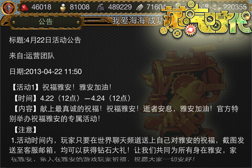 空中网旗下备受玩家欢迎的新科技幻想题材手游《蒸汽时代》,拥有众多的有爱玩家,他们在这里体验着各种乐趣与激情,释放着每一刻的喜怒与哀乐,或开心,或难过,只是单纯的做着自己,不用再那么含蓄的隐藏。而在过去的几十个小时,“中国雅安地震”这六个字始终牵动人心,《蒸汽时代》全体玩家以及空中网全体员工均众志成城,为雅安祈福,分别以不同的方式共同见证爱心! 【祝福雅安 为生命祈福为雅安加油】 北京时间2013年4月20日8时2分在四川省雅安市芦山县发生7.0级地震,房屋被毁,伤亡严重,全国人民揪心不已。这也是继2008年8.0级的汶川大地震之后,强烈大地震再次袭扰四川省,虽然自然灾难不可避免,但我们不能被灾害打倒! 为此,《蒸汽时代》特别开启了一个为雅安灾区同胞祈福祝愿的活动,玩家们可以到在游戏中参加活动,说出自己对雅安人民最诚挚的祝福。在大灾面前,抗战雅安,和雅安人民一起渡过最艰难的一刻! 【活动】祝福雅安!雅安加油! 【时间】4.22(12点)—4.24(12点) 【内容】献上最真诚的祝福!祝福雅安!逝者安息,雅安加油!官方特别举办祝福雅安的专属活动! 【注意】 1.活动时间内,玩家只要在世界聊天频道送上自己对雅安的祝福,截图发送至客服邮箱,均可以获得钻石大礼!让我们共同为所有身在雅安,家在雅安,亲人在雅安的游戏玩家祈福,祝愿大家一切安好! 2.活动奖励将在活动结束后24小时内发放。 当灾难再一次降临在中国西南土地上,我们再一次心系灾区,雅安,牵动着全中国13亿同胞的心。让我们《蒸汽时代》的所有玩家共同为雅安祈福,地震不可怕,因为我们和你在一起! 【情系雅安 空中网员工捐款献爱心】 当灾难来临之时,空中网全体员工也行动了起来。空中网在4月22日与23日这两天同时在北京、上海、天津、南京、厦门五处办公地,举行为雅安祈福,爱心捐款活动。其中,单4月22日一天中就收到500余位有爱心的员工的将近10万元的捐助款,当然,截止发稿前还未统计完23日的捐款数额。 这只是一次很简单的捐款活动,但同诸多心系灾区的玩家一样,一样包含着诸多爱心人士对雅安灾区的无限祝福,愿雅安一切安好。而游戏内来自四川的玩家更是得到了来自联盟内的兄弟姐妹不断的关怀和慰问。愿雅安早日走出阴霾,也希望诸位身在四川灾区的玩家同仁能够一切安好! 【心系雅安 理性救灾延续生命之火】 其实或许在说到游戏的时候,我们不应该把地震中的灾难与难过也联系在一起。可是,玩家也是人,虽不说希望宇宙和平这样的大话,但是却真心希望,身边的人,乃至我们所有的人都健康快乐,希望雅安能坚强,四川能好起来。那些正值一线的勇士们,感谢你们让我们看到更多生命的希望。 在巨大的灾难面前,每一位玩家都想尽自己的绵薄之力,甚至也许有玩家也想前往救灾第一线参与抢救工作。但是为了延续生命之火,我们更需要做到理性救灾。如果没有重要事情,尽量少占灾区的通信网络,给灾民留出求救的通道;如果您想前往灾区救灾,最好联络相关救援组织,不要单独前往,以减少对于道路的占用,保证生命通道畅通安全;尽量少去转发和发布单纯的祈福微信、微博,那样会造成网络信息泛滥,可能降低求救消失被看到的几率。 愿生者坚强,逝者安息,让我们一起为雅安祈福!雅安,加油! (更多游戏资讯请访问叶子猪游戏资讯中心:http://news.yzz.cn/) [编辑:必杀技]