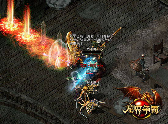 【海军上将贝克特——玩家实力的真正考验】 来到“无尽之地终极层”即意味着玩家要挑战“无尽之地”的最终boss海军上将贝克特了,然而心高气傲的贝克特并没有将玩家放在眼里,并且不屑与玩家亲自较量,而是不断召唤出守将魔物,只有不断击杀这些守将魔物才能对上将造成伤害,当对上将造成一定的伤害之后,他便会承认你的实力,亲自下来与玩家交手! 海军上将贝克特召唤的守将如海啸般席卷而来,异常难缠,只有配合默契,实力强劲的高端团队才能力挽狂澜,如果击杀慢了,上将得到喘息机会还会进行回复,不过某个职业的技能也许能够抑制他的回复…… 而当贝克特从甲板上跃下,说明他已经认可你的实力,贝克特的实力自然是毋庸置疑,此时一切的花招和阴谋都成了浮云,考验玩家真正实力的时候到了,战个痛快吧! 好不容易击败贝克特之后,看来这位上将并没有服输,在留下了一句意味深长的话后就悄然离去,难道“无尽之地”更深处还隐藏着什么天大的秘密吗?世界的尽头仿佛触手可及,却又永远遥不可及……看来“无尽之地”也只是世界尽头的冰封一角,更多解封的契机还在龙界大陆的暗涌之下静静地酝酿,等待勇敢者的发现!