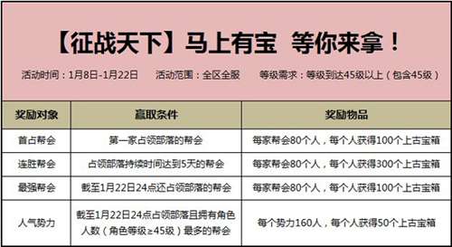 战旗猎猎,号角声声,寂静的王庭,即将迎来史无前例的热血厮杀! 被遗忘的远古之地向冒险者们敞开了尘封已久的大门,战火硝烟、金戈铁马,豪情和杀戮一触即发! 2014年1月8日,备受期待的《零世界》首部大型资料片“征战天下”隆重上线!让我们随征战女神的脚步,踏入全新战场! 新服推荐:双线四区【征战天下】>>> http://wz.sdo.com/web5/news/newsContent.asp?id=199629&CategoryID=3158 【王庭争霸战,上古宝箱花落谁家?】 新资料片“征战天下”与往昔最大的改变就是设定了以“征战”为主题的全新地图,在血之平原这片被上古神族所遗留下来的神秘之地,玩家们将会开启浴血奋战的疆场,以公会为单位对势力领地发动争夺战。当成功击毁领地王庭中的四根图腾柱,打败被召唤出的领地神兽后,即宣告公会夺得对势力领地王庭的占领权。 在本次开启的新资料片“征战天下”中,《零世界》为参与战斗的玩家们准备了丰厚的“部落礼包”,等待胜利者领取。从1月8日资料片更新直至1月22日24点,所有等级到达45级及以上的玩家均可参与。打开上古宝箱,可随机获得上古金属、上古宝石等珍稀道具。顶级荣誉,超值褒奖,不容错过! 【土豪金红装 笑傲江湖无人能敌】 随着“征战天下”的开启,将取得金装视为副本之行最高点的时代已彻底终结!最新神级红装——上古神器腾蛇套,全套共有11件的腾蛇套无需洗炼,所有的进阶属性都会直接分配到套装属性中,固定三孔九星的装备特点让它稳稳坐牢“征战天下”第一装备的宝座。想要获得这套傲视天下的绝品红装的话,就需要挑战“征战天下”新增的神域地图来取得图纸与制作材料。