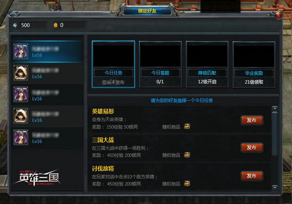 新手引导相关 战友招募开启 我们同样发现MOBA游戏因为其在操作及经验上具有一定的门槛,导致对新手玩家不是那么友好。没有人喜欢在刚接触一款新游戏时就被老玩家嘲笑,帮助新手迅速成长在我们的开发计划中占有重要地位。 《英雄三国》在3月新版开启了一项战友招募功能,在老玩家邀请好友进入游戏或一名新手进入游戏后,他们可以通过这项功能确立或寻找招募关系。一旦招募关系确立,双方将可以通过发布任务、答题、一同游戏等方式进行互动,而这些互动将帮助被招募者更好地理解游戏和练习技术。在此过程中,被招募者将可以使用招募者所拥有的全部英雄,并且双方都能根据被招募者的成长情况获得奖励。 新版“代言人”孙权上线 系列版本活动开启 相当一部分玩家都曾对《英雄三国》中还未有孙权这一英雄感到不解。如今,他来了,至此魏蜀吴三王归位,正式开启传奇色彩的三国时代。 孙权的英雄专题站:http://y3.163.com/newhero/sunquan/ 年仅19岁便继位吴侯的孙权是一位法术型(AP)英雄,可通过操控天命武器“吴帝令”制造团控和输出大量伤害,英雄形象及技能在设计上都主要围绕“掌控”这一主题,并用星、云等天体元素寓意帝王之气。 这位东吴帝王的到临也带来了一系列版本活动: 景云东来(3.12-3.18版本前夕) 进行任意PVP匹配或PVE游戏后,都有几率获得宝箱,每天最多可获得4个,可开出坐骑、橙色装备及各类珍稀材料 3月15日、3月16日晚18:00-22:00玩家可获得额外1倍的基础经验或历练 黄龙出世(3.18-4.1版本来临) 3月18日至3月25日期间,玩家可以选择加入魏、蜀、吴中的一个国家,进行PVP匹配、PVE游戏和打造装备后均可获得积分,每天重置积分,并根据积分获得奖励 3月18日至4月1日期间,达成不同条件以收集点亮“吴”“主”“降”“临”四字,根据所收集到的字数获取奖励(集齐四字最高) 进行新10v10模式比赛8场可点亮“吴”字 两周在线时长累计20小时可点亮“主”字 两周匹配场次达到14场可点亮“降”字 两周登陆天数大于等于12天或3月22日19:00-22:30期间登录可点亮“临”字 3月22日13:00-18:00期间,在此期间进行的所有PVP匹配赛(不含排位赛)均不计负场,经验获取也按照获胜计算,且此期间开启3倍基础经验获取 3月22日18:00-19:00期间,在线玩家每隔15分钟可获得1次历练值 逐鹿中原(10v10模式)全新改版后,将被纳为“挑战开发组”活动的项目之一 推出新手礼包和老玩家回流礼包,送出包括英雄令等珍贵物品 歃血为盟 组队排位赛开启 继12月单人排位赛开启后,组队排位赛也一直紧密筹备。在我们的设想中,参与组队排位赛的战友间应具备更强的互动性,而不是单纯的“5黑”。因此除了战力评级,我们还加入了“亲密度”这一成长指标。 玩家们通过“桃园结义”结成歃血盟,而当同一个歃血盟中的玩家一起进行组队排位赛,将会增加亲密度,亲密度将影响“血盟技”的解锁,包括组队共享英雄、共享皮肤、经验加成等。相对地,歃血盟的战力评级则与单人排位有类似的官阶评定方式,将影响到赛季结束时的一次性奖励。 其它更新 除上述信息外,本次更新还包含以下内容: 新增武将征战玩法,在城镇中进行,玩家挑选武将,通过各种方式对其进行强化,并挑战擂台上的英雄。胜利场次越多,获得奖励越丰厚; 九宫变新boss:黑龙司马昭与青龙关羽; 武将试炼增加新难度,增加多个英雄同时挑战的玩法 以上为《英雄三国》三月版本的主要新内容,旨在为玩家提供更平衡、全面、丰富的游戏体验。这些只是我们研发过程中的阶段内容,我们将继续在官网、论坛上分享我们的想法,希望能加深大家对《英雄三国》、对我们工作方向的理解。同时欢迎大家到《英雄三国》中感受新锐的竞技理念,并提出宝贵意见! 关于《英雄三国》 《英雄三国》是由网易自主研发运营的首款英雄对战竞技游戏,也是网易电竞战略下首款标杆产品。《英雄三国》采用虚幻3引擎,引入次世代效果,全面升级MOBA游戏视觉体验和操作感。游戏根据三国史实,原创英雄形象、技能和物品,还原真实的三国英雄。游戏以公平竞技为核心,所有英雄免费使用,玩同时引入全新的精准匹配系统、防挂机和残局补人机制等,让玩家畅快享受5V5竞技乐趣,。于此同时,《英雄三国》首创了“5V5V5三方对战”以及“10V10激情杀戮”新玩法模式,为玩家带来更多新乐趣、新体验。 (更多游戏资讯请访问叶子猪游戏资讯中心:http://news.yzz.cn/) [编辑:必杀技]