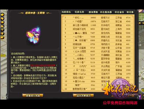 《桃花源记》年度“桃花美人”选拔赛将于5月11日落下帷幕,继2013年“还你公平世界”的主题后,2014年《桃花源记》公平理念再升级,以“爱在桃花源”为主题,深挖游戏社交玩法,持续打造充满爱与公平的游戏世界。 “桃花美人”选拔赛至3月份开赛以来,共收到120385张上传照片,距离5月11日比赛尾声的临近,选拔赛的赛况也愈发白热化,,每一天美人排行榜的排名都在发生着变化。经过美人之间激烈的角逐,以及玩家们踊跃的投票,2014年度“桃花美人”即将诞生! 不能让女神失望,快来投票送花吧! 凡是等级达到40级以上,当天活跃度达到60以上的玩家,每天可以获得2票资格,用于决赛期间给参赛美人投票,还可以跨服投票的哦! 4月24日22点59分59秒(以北京时间为准),系统将会根据美人在初赛阶段获得票数进行优先排序。每个服票数前3的玩家代表分服进入决赛,届时初赛获得票数清空,鲜花数保留。 在4月25日更新后至5月11日22点59分59秒(以北京时间为准)决赛期间内,大家可以继续给美人送花投票。