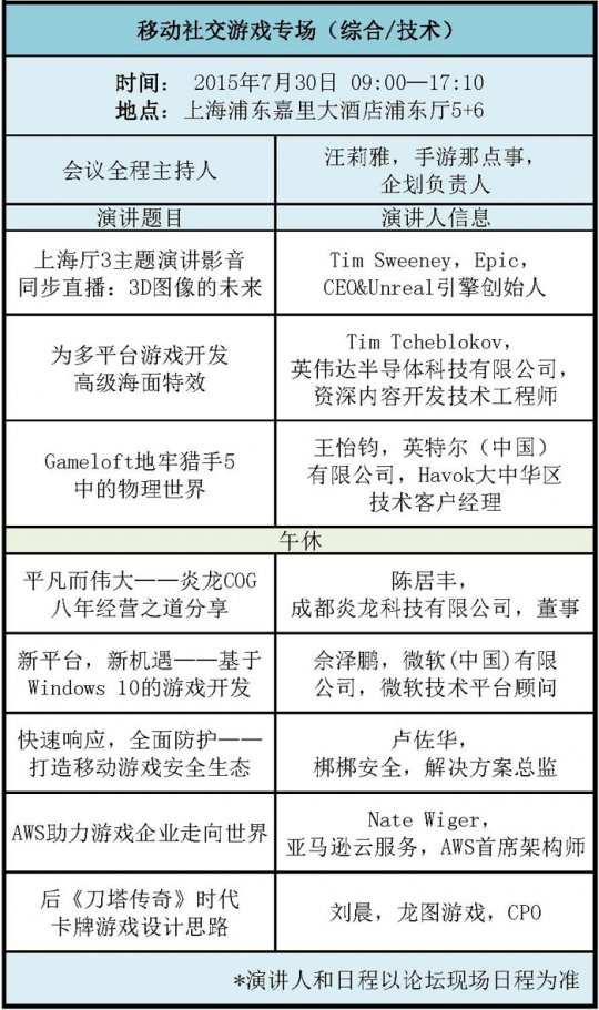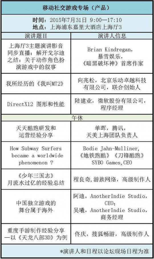 2015ChinaJoy将于7月30日在上海新国际博览中心拉开帷幕,中国游戏开发者大会(CGDC)也将于7月30日、31日在上海浦东嘉里大酒店同期召开。近日主办方汉威信恒展览有限公司正式公布了CGDC移动社交游戏专场的议程,确认了将会出席会议的演讲人名单和演讲主题。 2014年国内手游产业的爆发重写了行业格局,让众多游戏从业者越来越看好移动社交游戏的前景,短短一年来多家手游公司崛起,精品手游层出不穷,多位行业资深人士都曾在各个场合表达对今后手游行业的信心。本届CGDC的移动社交游戏专场在以往的基础上,力邀全球移动游戏行业的精英,刷新了手游行业嘉宾阵容的规格,包括策划/运营、综合/技术、技术/音频、产品和技术/综合的五大分会场,邀请到了目前全球最具影响力的多位资深游戏人,就移动社交游戏的各个细分领域展开交流讨论。 以下是汉威公司官方公布的移动社交游戏专场议程: 购买会议CGDC Pass请访问: http://topic.huodongxing.com/chinaJoy2015/pc/index.html 关于中国游戏开发者大会 中国游戏开发者大会(简称CGDC),是中国最具权威性、国际性、专业性的游戏产业研发技术会议。大会以促进我国游戏产业自主创新,搭建我国原创游戏走向世界的平台为宗旨,以共享最新游戏开发技术成果、探讨游戏开发技术新趋势为目的,力求成为促进全球游戏开发者相互交流、学习、合作的国际化专业盛会。顺应全球移动游戏崛起的潮流趋势,本届CGDC增加更多移动平台开发技术的课程讲座,并邀请更多的国际一线游戏制作人前来参与研讨。同时,上海自贸区的设立和国家有关自贸区内游戏机产业政策的落地,游戏机和游艺机(街机)市场的全面开放为国内游戏的开发者提供了新的发展空间,为此,CGDC将特邀全球家用主机平台商及家用机游戏年度大作的开发人员为有志进入这一国内游戏新领域的开发者提供技术解析。 详情请访问: CGDC官方网站:http://www.chinagdc.com.cn/ 有关大会议题征集和演讲请联系会议部: 孙先生 电话:51659355-8010 邮箱:sunny_sun@howellexpo.com 张女士 电话:51659355-8020 邮箱:shelly_zhang@howellexpo.com 有关媒体宣传合作事宜请联系市场部: 朱女士 电话:010-51659355-8048 邮箱:Sabrina_zhu@howellexpo.com 苏女士 电话:010-51659355-8033 邮箱:sultan@howellexpo.com (更多游戏资讯请访问叶子猪游戏资讯中心:http://news.yzz.cn/) [编辑:放学别走]
