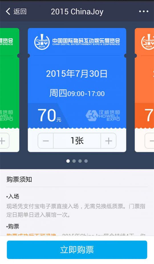 一年一度的ChinaJoy将于本月底正式开展。ChinaJoy官方将在本届展会中继续力推手机购票,去年ChinaJoy和支付宝合力推出的电子门票获得了不错的反响,为玩家提供了方便,而支付宝钱包今年也将继续担当ChinaJoy官方唯一的电子票销售渠道。今日起,用户在支付宝钱包中的“2015ChinaJoy”服务窗就可购买展会门票。另外,展会将为支付宝购票观众设置专属入场通道,支付宝钱包用户扫描电子票即可入场,十分简单快捷。 2015ChinaJoy支付宝购票界面 ChinaJoy唯一指定电子票购票渠道 作为国内最具影响力的数码互动娱乐展会,ChinaJoy每年夏季在上海举办,为期4天。全球各地知名的游戏厂商、娱乐硬件厂商都会在ChinaJoy上展出各自的主打作品。据报道,2014年的ChinaJoy首日入场人数超6.2万人,整届展会参观人数则突破25万,创下历史新高。 2015ChinaJoy将在7月30日正式开展。为了方便用户购票,ChinaJoy入驻了支付宝钱包的服务窗平台,支付宝用户在“2015ChinaJoy”的服务窗中就可以随时随地购买电子门票。 在支付宝钱包中购票的操作流程十分简单。用户进入支付宝钱包中“服务窗”版块后,点击右上方的“添加”按钮,然后搜索“2015ChinaJoy”就可关注该服务窗。在这一官方服务窗中,用户点击“立即购票”就可购买任意一天的展会门票。购买成功后,电子门票会同步到支付宝钱包的“电子券”平台上。除此之外,用户扫描下方的购票二维码之后,也可以直接购票。 支付宝用户专属通道进场更快捷 由于每年的ChinaJoy都人气爆棚,因此如何减少排队进场的时间成了官方和观众都非常关心的问题。 为了完善整个展会的无纸化购票体验,本届ChinaJoy为支付宝钱包购票用户设置了专属的入场通道。支付宝钱包用户在展会现场进场时,只需打开支付宝钱包里的电子门票,经橙色通道扫描通过就可入场。相比纸质票的排队验票方式,电子票进场的流程更标准快捷,排队等待的时间也更短。 ChinaJoy电子门票入场流程 其实从2012年以来,支付宝与ChinaJoy就在电子购票、场内支付等多方面展开合作,共同推动整个展会的电子化和移动化水平。据支付宝方面透露,今年展会中,支付宝钱包也将开辟专属的展台,并在现场设置售货机、便利店等多种多样的线下支付体验场景,让参展观众们通过手机就能玩转ChinaJoy,便利又好玩。 详情请访问: ChinaJoy官方网站:http://www.chinajoy.net/ 有关参展和赞助事宜请联系销售部: 万先生 电话:010-51659355-8008 邮箱:trix_van@howellexpo.com 于先生 电话:010-51659355-8037 邮箱:fisher_yu@howellexpo.com 王先生 电话:010-51659355-8011 邮箱:allen_wang@howellexpo.com 孙先生 电话:010-51659355-8009 邮箱:sun_miao@howellexpo.com 李先生 电话:010-51659355-8002 邮箱:mike_li@howellexpo.com 有关媒体宣传合作事宜请联系市场部: 朱女士 电话:010-51659355-8048 邮箱:Sabrina_zhu@howellexpo.com 苏女士 电话:010-51659355-8033 邮箱:sultan@howellexpo.com (更多游戏资讯请访问叶子猪游戏资讯中心:http://news.yzz.cn/) [编辑:放学别走]