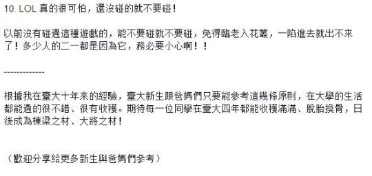 开学季,大学又涌进了很多新血液,对此台湾大学电机系副教授叶丙成给大学新人的十条建议里有一条就是“《LOL》真的很可怕,还没碰的就不要碰!”。 叶丙成教授也指出,新生最容易被二一的退学方程式,就是脸皮薄不敢跟人谈话,造成自己独来独往,课业也没人可以讨论,于是就开始沉迷网络在宿舍变成烂泥一路到被退学,他建议新生一定要学着厚脸皮,努力认识新朋友,只要能交到许多朋友,大学就可以安稳度过。 对于大学教授将游戏视为洪水猛兽的行径以及公开言论,刚刚不久之前美国总统候选人马克罗·卢比奥在公开演讲中称赞《我的世界》将会为美国培养更多的人才,这是中美两国对待游戏的看法不同而产生的差异吗? 叶丙成教授脸书对新生的劝告: 发现自己的言论引起了轩然大波之后,叶教授又发布了一条信息立马改口,称不反对玩游戏。 ![]() 网友评论 关你屁事。 手机更可怕。 真的会分配时间的人,玩什么游戏到底有啥关系。 干脆说完全不要娱乐好了。 女朋友很可怕,打工很可怕,读课外读物很可怕。 真可怕,该打场LOL压压惊。 没有自制力,怪游戏好玩所以可怕。 我不过每天打场首胜而已,是有多可怕啦? 建议上台大不能带手机玩电脑混夜店逛夜市交女友。 长毛、记得、叉烧都是台大毕业的,读不毕业是自己的事。 趁读书赶快打,开始工作了拿首胜都觉得累。 可怕的不是游戏,是孤单鲁蛇(loser)。 对许多没有自制力的学生而言,LOL确实很可怕。 只有教授才能让人被二一,关LOL屁事。 教授除非恶意搞你,不然被二一永远是学生自己的问题。 教授说的很有道理,一堆人硬是要曲解成打LOL就会被二一。 怎么不说有人大学没毕业打LOL打到世界冠军拿了100万。 结果其实教授自己是大师。 (更多游戏资讯请访问叶子猪游戏资讯中心:http://news.yzz.cn/) [编辑:Bkhalo]