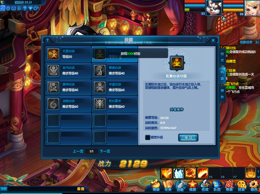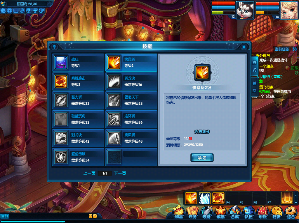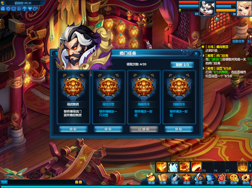 小编这里选择的是镇国府,毕竟三刀太霸气!加入门派后就不能更改了,所以机会只有一次,侠友要注意了。 加入门派后可以按快捷键ALT+V打开技能画面,已经点亮的技能图标就是可以学习的,黑白的技能图标就是任务等级未达到学习要求,技能等级的越高,伤害越大,每次学习都需要耗费一定的金钱,等级越高,耗费金钱越多!除开技能之外,还可以学习内功,增加自己的伤害或者是生存能力等。 拜师后,可领取师门任务,每天可完成20个,师门任务也分4个品质,紫、蓝、绿、白,其中完成紫色任务的奖励最好,白色是最低的,每天有3次刷新任务的机会,师门任务分为寻物、挖宝、战斗、送信等几种。