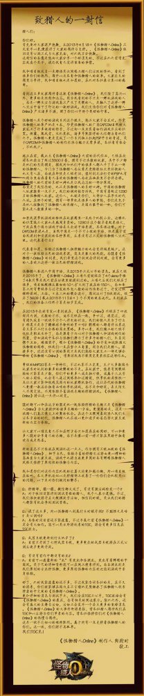 猎人们: 你们好。 首先要对大家说声抱歉,从2013年4月18日《怪物猎人Online》正式发布以来,便获得了大家的期待与支持。《怪物猎人Online》依旧没有公测正式与大家见面,对此我万分抱歉。 这封信的本意是想向大家分享一个好消息的,不过在此之前请先容我卖个关子,说些我自己觉得重要的事情。 我和项目组成员一直都很关注网络上猎人们活跃的阵地,看到了很多你们的抱怨、期许以及各自和怪物猎人的故事。大家长久的期望与等待,我和项目组也是知道的,在此对各位表示衷心的感谢。 看到这么多玩家期待着这款《怪物猎人Online》,我们除了高兴以外,更多的是欣慰和忐忑。因为我看到的不只是一群玩游戏的人,而是一群生活与游戏真正产生了关联的人,是融入了这样一群人生活中留下了印记的一款好游戏。我们生怕你们对《怪物猎人Online》产生诸多不满,毁了你们心中那个美好的印象。 怪物猎人是个好的游戏系列这个观点,想必大家不会反对。毕竟怪物猎人的原产地是日本,毕竟怪物猎人的厂商CAPCOM虽然被大家冠上了许多诙谐的称号,不过却一直坐实着动作游戏巨头的位置。街霸、鬼武者、生化危机,诸多耳熟能详的大作都出自他们之手。怪物猎人更是完成了一个系列独立扛起PSP平台的奇迹,关于CAPCOM和怪物猎人的制作水准与魅力无需多说,各位自有体会,不比我少。 珠玉在前,截止至《怪物猎人Online》之前的历代作品,已经在全球各地卖出了超过3300万套,拥有不计其数的玩家,其中不少都是他们的忠实拥趸,据我所知他们中的很多人都入手了不止一部的怪物猎人,专门为了怪物猎人而从索尼党转投任天堂怀抱的人也大有人在,而现在即使是已经老旧、损坏到无法打开的PSP也有人因为里面存着自己喜欢的怪物猎人而收在抽屉里不舍得丢掉。怪物猎人的之前的良好口碑也是让我忐忑的一部分原因。 而坚定了我信念的,也正是怪物猎人的良好口碑。中国的怪物猎人玩家数量一直不少。我们的调研报告诉我,中国有着超过1290万的怪物猎人玩家。这些人,也就是你们,大部分人在学生时代入坑。在那个时候,拥有一部掌机是很多人的梦想,你们是先于其他人接触到了怪物猎人的老猎人,是国内最早的一批,你们可能也是人数最多的一批。 如果我说掌机游戏的粉丝在玩家圈里一直处于比较小众、边缘化的位置想必大家也是感同身受的。1290万这个数字看起来很大,可放在整个国内游戏市场甚至全球市场来说,其实很边缘。对于CAPCOM来说也是,虽然中国是一个不可小视的市场,但是基于前面我说到和没说到的各种原因,从来没有过正式的怪物猎人汉化版。这代表着什么? 代表着知道、体验过怪物猎人独特魅力的也会变得越来越少。这对于一款体验出色的游戏来说,简直是最大的悲剧。而随着《怪物猎人Online》的到来,我们希望这个状况会得到改观,会有更多的人喜欢上这样一款出色的狩猎游戏。 怪物猎人要进入中国市场,是2013年正式公布的消息。现在已经是2015年了,《怪物猎人Online》立项之前就经历了4个demo并换了4款引擎是我之前在访谈里就提到过的。立项之后我们又经历了很多,项目组规模从最初的10人扩大到了现在的150人,而如要算上所有曾经参与过开发的外包人数的话恐怕要过千,开发过程横跨深圳、上海、日本三地的联合进行,期间运行了5次测试、经历了3609(截止2015年11月6日)个不同的版本迭代。直到现在,我们的准备工作终于算是初步完成。 在2013年全球首发以来到现在,《怪物猎人Online》共经历了四次封闭内测,无数的汗水,泪水交织在一起,争吵过,迷茫过,还有团队成员一次次不计个人得失的付出,我们的投入是为了什么?难道只是为了赚眼球吊粉丝的胃口吗?聪明的人都看得出来这甚至算不上什么合格的商业策略。多年以来,我们赌上的已经不仅仅是职业生命了,而是源自于内心对于怪物猎人和游戏制作的热爱,亦如游戏中各位与怪物们搏斗了许多年的猎人们,队员间携手互助,顽强坚守,明知《怪物猎人Online》的开发如战胜强大怪物般的困难,但我们一直在努力且自豪,因为我们是猎人。深耕多年、迟迟没有公测的原因只是我们想给大家呈上一部足够合格的《怪物猎人Online》,请原谅我尚不敢用完美来形容这部作品。 曾经的MHP2G算是一部神作,不过也算不上完美,至少大多数国内玩家当时玩到的最多的破解版的不是。在玩家中,想来有网联经验的只能算是少数,你们中的更多人或是独行侠,或属于三五号人的小团体,也会有人通过网络参加过猎团,但掌机的局限性一直让大家只能和视线范围内的玩家联机协作,这让历代的怪物猎人更像一款适合独自品味的单机游戏,而不是和好友、甚至陌生人共同交流、共同体验丰富游戏乐趣的狩猎游戏。《怪物猎人Online》将让这一点得以改变。 随时都可以和在远方的朋友地一起体验狩猎的乐趣只是《怪物猎人Online》为大家提供的诸多乐趣的一方面。更重要的是,这是一次猎人们真正意义上欢聚的机会。在这个互联网基因渗入我们生活各方面的时代,怪物猎人也应该以更加进步的姿态为大家呈现新的内容与体验。 让大家可以预见自己不知在何方而只知道存在的同好,可以和更多人随时分享自己的乐趣,而不是像以前一样只能在黑暗中独自欢乐或是悲喜。 新的姿态不只体现在网游化这一点上,作为拥有正统血统的《怪物