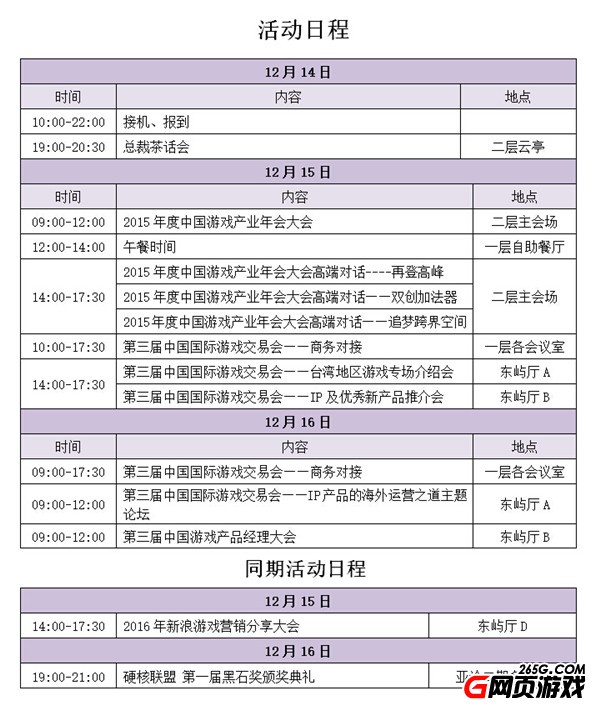 魅力海南,相聚博鳌。2015年度中国游戏产业年会将于12月14日至16日在中国海南博鳌亚洲论坛国际会议中心举办。本届年会由国家资讯出版广电总局主管,中国音像与数字出版协会主办,中国音数协游戏工委、海南生态软件园承办。 2015年对于中国游戏行业来说可谓是变革之年,传统游戏厂商发力移动游戏行业,海外厂商看重中国市场并进军国内,电商背景的互联网企业也纷纷走入游戏圈。此外,以H5游戏、VR游戏、游戏电竞等为代表的游戏风口也正以惊人的速度不断向前发展。为此,2015年度中国游戏产业年会特将今年的主题定为“让你看到未来”。 今日,大会主办方正式公布了2015年度中国游戏产业年会的详细日程,总裁茶话会、产业年会大会、产品经理大会、“游戏十强”盛典等活动将依次亮相。 ![]() 作为最具权威性的中国游戏行业盛世,中国游戏产业年会已经走过十二载,在这里已经留下太多游戏人的足迹。2015年度中国游戏产业年会,让我们齐聚博鳌共襄盛举,一起鉴证中国最大游戏行业活动的召开。 2015年度中国游戏产业年会官方网站 2015年度中国游戏产业年会报名地址 http://2015.cgigc.com.cn/2015cgiac/join.html 第三届中国游戏产品经理大会报名地址 http://2015.cgigc.com.cn/thirdpm/index.html 第三届中国国际游戏交易会报名地址 http://2015.cgigc.com.cn/thirdgf/index.html 参会报名咨询 联系人:刘红彬 电话:010-57432150 手机:13681322962 QQ:248240939 邮箱:liuhb7@163.com 传真: 88334548 赞助合作洽谈 联系人:黄玉萌 电话:13601367412 微信:59987566 邮箱:59987566@qq.com QQ:10612497 媒体合作 联系人:张楠 电话: 57432158 手机: 15011209815 邮箱: 200068768@qq.com 联系人:盛娜 电话: 57432155 手机: 15810237432 邮箱: 326347145@qq.com 中国国际游戏交易会 咨询联系人:黄玉萌 手机:13601367412 QQ/微信:59987566 邮箱:59987566@qq.com 国内CP产品资料提交:黄建军(小黑) 手机:18917099445 QQ: 2058426594 邮箱:huangjianjun@uzonegames.com 中国游戏产品经理大会、中国游戏产业报告、中国“游戏十强”盛典 联系人:郑南 手机:13661273733 QQ:51440783 邮箱:51440783@qq.com (更多游戏资讯请访问叶子猪游戏资讯中心:http://news.yzz.cn/) [编辑:Bkhalo]