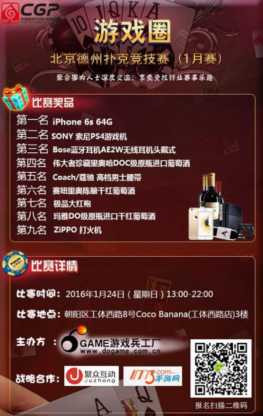 1月24日CGP中国游戏行业扑克锦标赛(1月北京站)报名啦! 还记得15年CGP德扑比赛无数次经典对决吗?2016年即将到来,1月24日另一场扑克竞技上演。Dogame游戏兵工厂组织的竞技主题类品牌赛事“CGP中国游戏行业扑克锦标赛(1月北京站)”报名开始了。本次赛事为游戏及移动互联网,金融投资圈的行业伙伴提供一个竞技沟通交流平台,本月的CGP比赛,以多桌MMT为主,同时比赛增加了边赛坐满即开SNG,计时方式:单桌单独计时器计时,畅玩扑克竞技。 CGP2015(12月北京站)德扑活动比赛回顾 活动报名地址:http://dogamehui-1-2-1-1-1-1.eventdove.com 【活动报名】:CGP中国游戏行业扑克锦标赛(1月北京站) 【活动主办】:Dogame游戏兵工厂 【战略伙伴】:聚众互动、11773手游网 【活动规模】:100-150人 【活动地点】:朝阳区工体西路8号Coco Banana(工体西路店)3楼 【活动时间】:1月24日(周日)13:00-21:00 【活动报名】:扫二维码报名 【比赛获奖】: 【比赛特色】 1、游戏行业中高层用户,CP研发、发行、投资渠道等。 2、特色竞技赛事,以牌会友,口碑传播,形成影响力。 3、派遣专业裁判团、美女荷官及软硬件设备保障; 4、超过60万次展示曝光,上百家媒体跟踪报道; 【比赛赛制】: 【联系我们】 参赛报名: 樊女士 电话:15010024690 QQ:1429636167 媒体合作: 张先生 电话:13146236356 QQ:393099405 赞助合作: 陈先生 电话:13718299969 QQ:402134158 【合作媒体】:浩趣信息、魔方网、游戏瓶、新浪游戏、上方网、手游那点事、搞趣网、游戏狗、91手游网、5G.com、11773手游网、苹果园、安卓游戏、4399手机游戏网、手游圈内人、安锋网、爱游戏、叶子猪、07073、游戏茶馆、蚕豆网、电玩巴士、178游戏网、蜜蜂网、笨手机、蜂游网、游戏鸟、游戏坛子、hao76游戏网、52pk游戏网、小皮游戏、GameRes游资网、玩客帝国、游戏日报、多游网、T游戏网、千军游戏、1688wan、有妖气、游戏观察、游戏智库、小伙伴招聘、1Y2Y网页游戏、游戏蛮牛、游戏港口、白鲸社区、游戏鲸鱼、9669手游网、掌游网、微手游、漫域联播、诚艺信动漫网、高校动漫、w707游戏网、动漫之家、361游戏网、动漫东东等 【相关介绍】: 聚众互动:2015年初成立于北京,并在成都设立发于研发中心,是成都聚众互娱网络科技有限公司的全资控股公司。公司主营业务为互联网棋牌移动端游戏,涉及研发、运营、赛事、娱乐等多重领域。 11773网站:汇聚了最热门的手机游戏,以最新最全为特色,在手机游戏网站中占有不可忽视的一席之地。2016年1月,11773手游网UV突破50万/日,日PV:150万。 (更多游戏资讯请访问叶子猪游戏资讯中心:http://news.yzz.cn/) [编辑:痴情B丶]