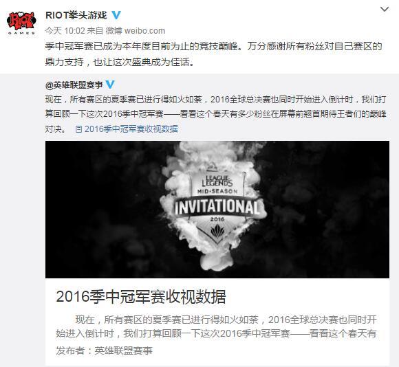 6月14日,拳头发布最新消息,5月在上海举办的2016LOL季中冠军赛,全球总收看人次为2亿200万人。 微博截图: 微博原文: 现在,所有赛区的夏季赛已进行得如火如荼,2016全球总决赛也同时开始进入倒计时,我们打算回顾一下这次2016季中冠军赛——看看这个春天有多少粉丝在屏幕前翘首期待王者们的巅峰对决。 今年季中冠军赛波澜壮阔,更胜从前——总计八个比赛日的对战游戏时长创下了历史新高——而在召唤师峡谷中,各种意想不到的大逆转更是让大家时刻都紧绷神经。 来自全球各地的粉丝们总计收看了长达1.19亿小时的直播内容(重播不计在内)——每日独立收看次数超过2.02亿次。与2015全球总决赛期间一样,这个数字是来自2016季中冠军赛期间的每日独立访客数总和。 峰值期间,有超过600万名观众同时在线收看季中冠军赛直播,而八个比赛日的平均同时在线收看数也达到了230万。 今年我们更勇于尝新——比如赛程的增量、令人血脉偾张的开幕式以及那惊艳夺目的LED舞台。在上海这个美妙的主办城市,我们听到了现场观众们的忘情呐喊,也见证了一幕幕被载入电竞史册的瞬间——RNG在家乡主场昂首雄据小组赛、CLG扛起北美大旗、SUP为土耳其赢得尊重、SKT再占世界霸主之位(这只是其中的一部分)——季中冠军赛已成为本年度目前为止的竞技巅峰。万分感谢所有粉丝对自己赛区的鼎力支持,也让这次盛典成为佳话。 |