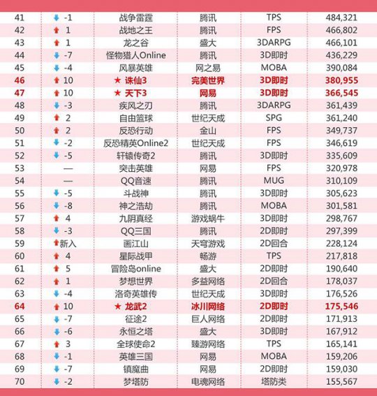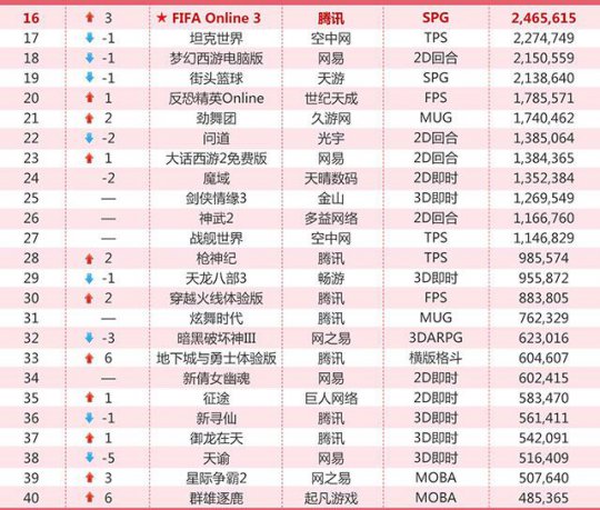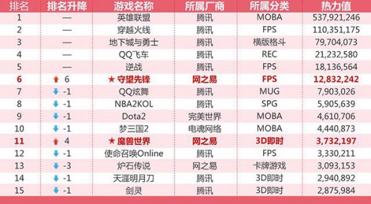 腾讯游戏讯 7月7日消息,6月网吧游戏排行榜前30名中,没有新游入榜,《守望先锋》、《魔兽世界》和《FIFA OL》上升幅度较大,其他游戏排名相对稳定。 本期看点:《FIFA OL》凭借着上个月欧洲杯的热度又火了一把,排名上升3名。魔兽电影在中国6月8日上映,带动了一批新玩家加入《魔兽世界》这个已经12年的老游戏中,本月排名上升了4名。黑马《守望先锋》表现较好,自上个月强势进入榜单排行12名后,本月更是又上升了6名。但和魔兽、守望出自同一厂商的《炉石传说》本月则是下降了3名,另外《问道(微博)》、《魔域(微博)》两款游戏的排名下降2名。 |