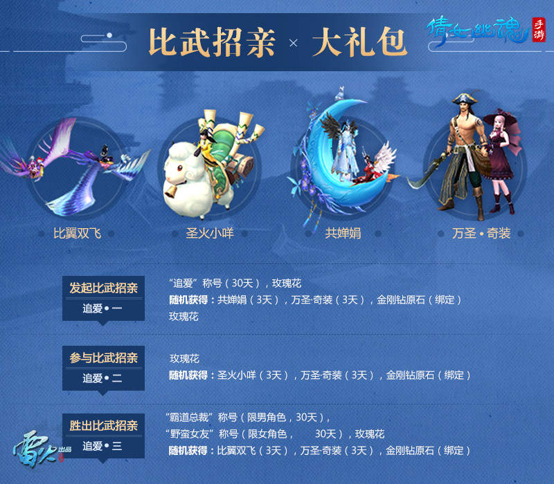 《倩女幽魂》手游开放婚恋系统至今,已经有无数少侠在三界中寻找到了命中注定的TA,不过,少侠们虽然在三界中都是呼风唤雨的江湖豪侠,但总有些人因种种原因“剩”了下来。现在,倩女幽魂手游比武招亲系统将在“双十一”前闪亮登场,活动期间每位开启招亲或响应并参加打擂的玩家,都将获得超值奖励,最终打擂成功的更有机会获取珍稀【比翼双飞】坐骑。此外,众多知名主播和倩女手游名人堂明星玩家,将在11月13号倩女幽魂手游“追爱之夜”,一同直播比武招亲追求爱情!少侠们,遇到心爱的TA,就果断出手“脱单”吧! 【追爱之夜大狂欢 撩主播还能赢取比翼双飞】 在倩女幽魂手游三界,最为酷炫的秀恩爱或撩妹神器就要数【比翼双飞】双人坐骑了!骑上【比翼双飞】的少侠们,定能成为人人艳羡的神仙眷侣,周游三界。在11月10日到13日“追爱之夜”活动期间,少侠们只要参与比武招亲并成为最终擂主,就有机会获得这款双人坐骑。 在11月13日晚19:30分,访问倩女幽魂手游官方网站,即可与斗鱼张琪格、阿科哥等7位俊男靓女主播线上互动,并在游戏内参与主播发起的比武招亲。观看直播参与互动即有可能收到主播送出的神秘礼物,这千载难逢的撩主播赢大奖活动千万不要错过! 【参与100%得个性称号 求爱成功即得定情道具】 此外,少侠们参加比武招亲,或者举办擂台,都有机会获得游戏内礼包奖励。发起比武招亲的少侠,将会获得独家【追爱】称号以及象征爱情的玫瑰花,并将随机获得双人坐骑【共婵娟】、【万圣?奇装】等奖励。参与并响应并打擂的玩家,也有好礼可得,杨洋同款【圣火小咩】没准就是你的新坐骑了。最后,打擂成功的男女玩家,将分别获得【霸道总裁】或【野蛮女友】的称号,个性十足! 那么,如何发起或者参与比武招亲,追寻心中所爱并赢取大奖呢,让我们一起来看?玩家只要到金陵发起比武招亲即可在接下来的1小时内等待玩家响应。招亲正式开始后,少侠就将化身第一任擂主,迎接单身异性玩家挑战。最终玩家若同意与擂主订婚,擂主即可获取道具“情定三生”,喜结良缘。悄悄告诉你,比武招亲可不限制单打独斗,无论守擂还是攻擂,都是可以请强力队友组队协助的。 新一代国民手游《倩女幽魂》是电视剧《微微一笑很倾城》虚拟世界架构方《新倩女幽魂》的官方手游,拥有端游级唯美画风与人设,传承经典玩法,男神杨洋倾力推荐!全新角色女甲士,转职系统现已上线,结拜系统,比武招亲本周敬请期待! |