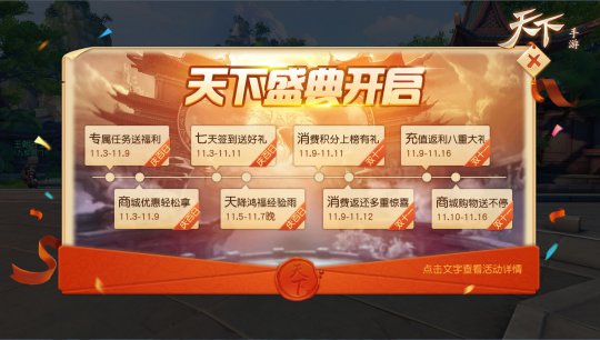 真3D极致画面,无缝大世界,网易顶级品质旗舰《天下》手游现已全平台开启。《天下》手游情缘系统开启,三石弟弟全程陪伴与你缘定三生,双十一盛大庆典火热进行中!多重豪礼惊喜不断,附带光环效果的专属称谓、丰厚的珍品奖励、帅萌的全新坐骑助你狂欢双十一! 【礼从天降,双十一多重豪礼返利狂欢】 在刚刚过去的百日庆典中,《天下》手游打造了各种福利活动回馈玩家的支持,感恩一路以来的陪伴。但是狂欢不落幕,豪礼不单行,盛大的双十一庆典正在进行得如火如荼,延续狂欢浪潮,礼从天降接踵而来!多重豪礼奏响返利进行曲,玩家在活动期间累积充值或消费达到一定数额时,即可获取各种珍品豪礼,助力闯荡大荒,让冒险之旅充满惊喜和幸福感! 双十一?充值返利八重大礼,当玩家在11月9日至11月16日24点前这段时间进行充值,累积到一定数额即可返还部分军饷,并且还能领取雷音溟钻、全新灵兽皮肤、金色专属称谓以及天域琉璃、红莲溟钻配方等超珍贵豪礼!八重奖励福利爆满助你征战大荒!但要注意的是充值返利的上限为1万元,超过该金额后将不会获得额外的军饷以及天下号令。 双十一?消费返还多重惊喜,玩家在11月9日至11月12日24点前这段时间进行消费,可以在活动期间获得返还的多重豪礼,各种加护炼化材料、技能书残页、潜能、神闪剑等珍品道具让你实力更上一层楼,无论是PVP还是PVE都能领先一筹,独领风骚。还有各种大礼包优惠抵扣券,折扣福利让你赚个爽快!除此之外,在11月17日领取额外返利,惊喜层出不穷,保证让你狂欢到底! 值得注意的是这次双十一盛典豪礼道具的使用期限,千万不要错过使用时间。同样的,消费返利也设有上限,消费金额达150000元宝之后也不会获得额外的奖励。此外使用优惠券或军饷的金额将不计入这次消费数额,兑换珍品豪礼时可要注意看清楚了。 【荣耀与财富的化身,天降财神你来当】 在双十一庆典中,除了让人目不暇接的珍品豪礼外,还有特殊的称谓让你瞬间扬名大荒,集荣耀与财富于一身,双十一财神就是你!11月9日至11日期间,玩家每消费1元宝即获得1消费积分,当日消费积分排行本服务器前十名的玩家可获得特殊称谓奖励!积分排行第一名的玩家将成为该服务器的双十一财神,以其形象天降九黎,成为“双十一财神”NPC,名扬大荒! 【全新珍兽坐骑上线,帅萌引爆双十一】 双十一庆典精彩无穷,两款全新珍兽坐骑隆重登场,帅萌引爆全场!激萌可爱的白猫“雪团儿”眨着天真无邪的大眼睛,头顶圣诞帽子,颈系铃儿叮当,身上还带着满装礼物糖果的圣诞袜子,一登场即奔着大荒最萌坐骑的称号而去,相信妹子玩家们应该会很喜欢它。 而另一款坐骑则是帅气无比的“风火轮”, 双轮暗藏风火之势,行动间有风雷之声,脚踏风火轮遨游大荒,相信是不少男玩家曾经憧憬的。这两款珍兽坐骑皆是匠心之作,让双十一庆典更显盛大,精彩纷呈! 这天下,你从未见过!掌中极致感官体验,八年匠心诠释!《天下》手游现已全平台开启零门槛畅玩!狂欢不落幕,双十一庆典火热进行中,海量福利热闹上天,匠心坐骑美绝大荒,快来参加双十一庆典狂欢吧! 了解更多相关信息,请前往http://www.yzz.cn/sy/tx/ |