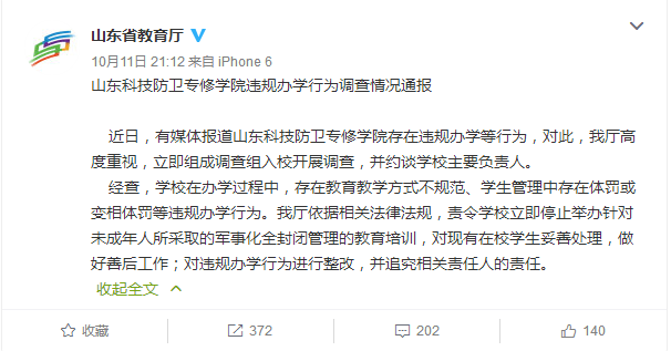 因为一篇名为“杨永信,一个恶魔还在逍遥法外”的文章,淡出人们视线已久网戒中心重回舆论焦点。近日有媒体曝光称,在一所名为“山东科技防卫专修学校”的网戒学校中,多名学生近期反映学校存在体罚行为。经山东省教育厅调查认为,学校在学生管理中确实存在体罚或变相体罚,责令立即停止有关办学行为,并将追究相关责任人的责任。 山东省教育厅在其官方微博发布的调查结果显示,这所学校在办学过程中存在教育教学方式不规范、学生管理中存在体罚或变相体罚等违规办学行为。 山东科技防卫专修学院在其官方网站上宣称,学校是全封闭的军事化管理学校,针对具有网瘾、厌学、叛逆、自闭、情感冷漠等心理障碍的学生,心理专家一对一进行矫正。 根据相关法律法规,山东省教育厅责令学校立即停止举办针对未成年人所采取的军事化全封闭管理的教育培训,对现有在校学生妥善处理,做好善后工作,对违规办学行为进行整改,并追究相关责任人的责任。 |