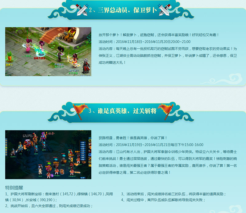 今日下午15:00,Q萌仙侠回合制大作《画江山》将开启全新版本——镇妖伏魔,内测新服也将同步开启!!此次内测新服将带来全新玩法——镇妖伏魔塔,少侠快来与我一起镇妖伏魔吧! 《画江山》新服神兽0元抽!下载试玩即送iPhone7,升级大礼包、满级礼包、预创建礼包,准备好接受礼包轰炸了没!更有壮观红包雨,游戏人生,全副武装! 新服名称:群英荟萃 新版本及新服开启时间:今日15:00 【轻松回合 快乐交友】 以轻松回合,快乐交友为主题的回合制游戏《画江山》,Q萌的画面风格赢得了众多玩家的喜爱。同时无加点制,DIY角色属性以及无限制级光武更是让玩家真正感受轻松快乐的游戏氛围。作为标准类型的回合制网游《画江山》,在秉承休闲娱乐的游戏特性基础上,进行了精美2D与全息投影3D融合的创新。一改传统回合制的呆板2D模式,使流水与花草树木全都具有了生命,给玩家带来传统回合制和即时战斗超爽快感的游戏及视觉体验。 【全新玩法 镇妖伏魔塔】 镇妖伏魔塔将在世界等级60级时开启,60级以上的玩家5人组队进入塔中,难度随层数的上升而上升,再爬塔的同时还能获得镇魔积分,可以在积分商店兑换道具。每周记录一次奖励次数,一周内以所闯到的最高层数最为记录,并且新增爬塔成就,想要拿到更高的成就吗?新玩法镇妖伏魔塔等你来挑战! 【超级大礼 在线抽iphone7】 只要玩家下载游戏、注册游戏账号并登录游戏即有机会赢取iphone7,玩家只需要每天登录游戏,进入游戏且30分钟(在线时间不累计)即有资格参与抽奖;每天登陆游戏可获得一次抽奖机会;获奖名单将在每天13时产生,同时当日奖品"随机阵法书"通过邮件形式发放到其游戏账号中;特等奖iPhone7 将在活动结束后,在所有符合参与抽奖(即活动期间每天在线30分钟)的玩家中产生。 【从天而降 壮观红包雨】 那年那天那场红包雨,让我脱贫致富走上发家之路。。。11月11号开始的红包雨至今已经使众多玩家成为了二次三次元共同的人生赢家!之前没领到的各位也不要哀嚎了,红包雨活动将在19号结束,在此之前登录官网参与活动,就有机会领取百万红包哦! 【镇妖伏魔 登录抽神兽】 御三界动乱妖魔现,镇妖塔出定江山!新服开服后,凡是登录游戏的玩家可在游戏里参与3次神兽抽奖活动(等级达到30级、等级达到45级、等级达到65级均可获得一次抽奖机会,幸运儿将获得神兽的亲睐,并将与神兽执手画江山!) 【新服活动 畅玩不停】 伴随着本次新版本【镇妖伏魔】的到来,新服活动也将在开服当天同步开启——好玩轻松又有趣的保卫萝卜大作战以及彰显王者属性的过五关斩六将活动,神兽魂、珍兽魂、高级宠物技能书、高级吊坠等等,超多宝物等你来拿! 《画江山》全新版本“镇妖伏魔”今日15:00震撼上线,全新玩法“镇妖伏魔塔”约你来战! 三十功名尘与土,八千里路云和月。金戈铁马,气吞万里如虎;壮志凌云,势拔山河似蛟。红袖赴琼阁,执手《画江山》! 了解更多相关信息,请前往http://www.yzz.cn/game/hjs/ |