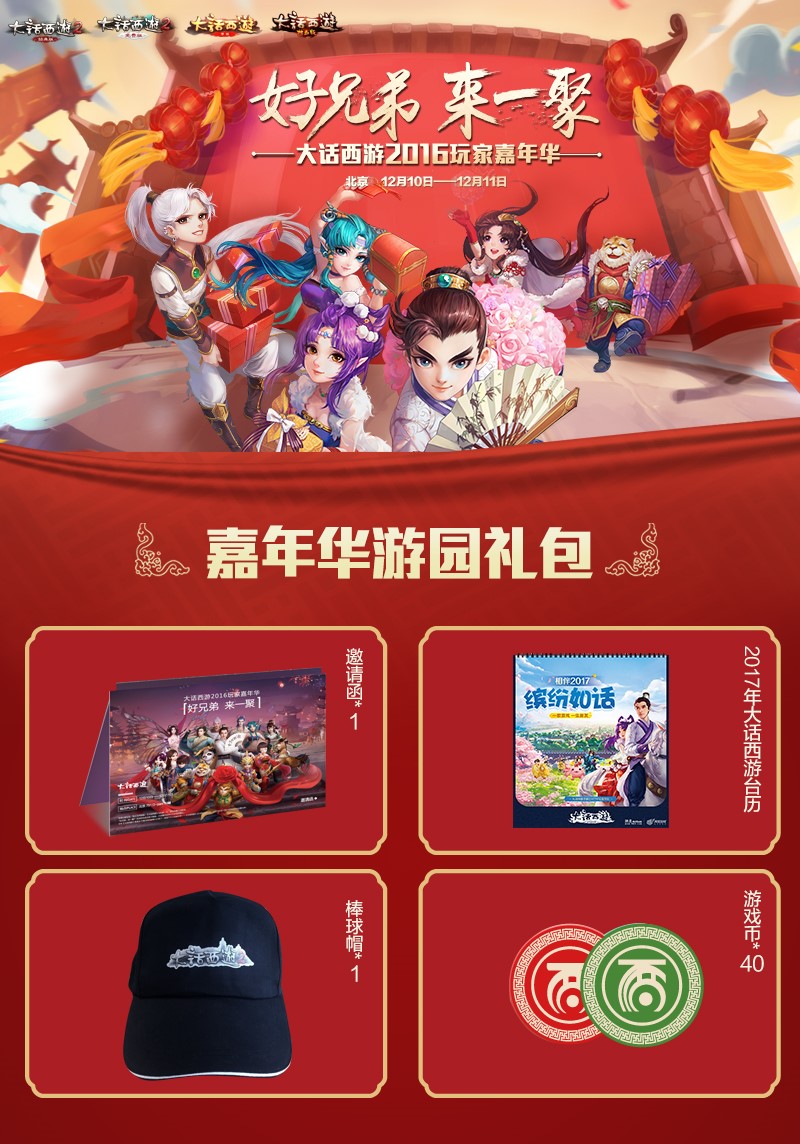 情义如歌,快乐永存!“大话西游2016玩家嘉年华”即将于十二月在北京盛大开幕。作为一场千人线下狂欢聚会,“嘉年华游园礼包”现已为玩家曝光,多重惊喜玩家福利火热来袭!与此同时,本次嘉年华活动专题也已在官网正式上线,体验趣味十足的现场活动内容,珍稀周边好礼赢不停! 嘉年华游园礼包实物曝光 丰厚周边好礼等你拿 十二月,“大话西游2016玩家嘉年华”即将震撼开幕,包含嘉年华入场门票在内的玩家专属礼包已于活动发售当天告罄,玩家反响十分热烈。在嘉年华狂欢盛典即将来袭之际,官方又为玩家带来了“嘉年华游园礼包”的实物内容曝光,独具大话特色的丰厚周边好礼即刻送上! 玩家除了获得“大话西游2016玩家嘉年华”邀请函,届时到达现场的玩家还会获赠精美的大话西游棒球帽、手提袋等大话周边福利以及嘉年华游戏代币、嘉年华游园地图等诸多嘉年华专属好礼,开启欢乐嘉年华游园之旅!此外,更有官方寄出的“2017年大话西游台历”,邀玩家继续珍存与大话相伴的精彩时光! 嘉年华狂欢来袭 精彩活动与你相约 作为大话玩家的又一线下狂欢盛宴,12月10日—12月11日,“大话西游2016玩家嘉年华”将在北京盛大开幕,嘉年华专题页面目前已在官网火热上线。所有大话玩家即将欢聚北京798艺术区751-D park 79罐(北京朝阳区酒仙桥路2号),享受丰富的线下活动,一同分享精彩喜悦、见证属于这场属于大话玩家的年度狂欢! 在嘉年华活动当天,官方将在现场重现长安城的经典风貌,还原熟悉的古都风韵,举行热闹非凡的大话西游游园会,“21点博状元”、“现场科举答题”等妙趣横生的游园互动游戏邀玩家来玩,更有多重珍稀大话周边奖励为玩家送上,让玩家在畅游大话江湖的同时,感受现实与游戏交相融合的全新体验! 与此同时,由国内知名COSER团队倾情出演的大话同人舞台剧《缘》,也将在本次嘉年华上首度亮相。将为玩家生动演绎祭剑魂与夜溪灵前世今生的爱情故事,唤起广大玩家心中的江湖侠义,再现大话江湖的悲欢离合与爱恨情仇! |