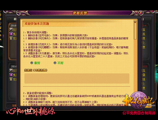 桃花源记运营至今,每次更新改版,我们都会听取玩家的大量建议,目前游戏中包括“全民战场”、“卧虎藏龙”、“羽化飞升”以及桃花游乐场中的多数游戏,都是根据玩家的反馈,沟通调整后呈现给大家。因此,我们又新增了一种玩家反馈渠道,以便更好与玩家对话。 玩家领袖 策划智囊团 官方策划了解玩家意见的重要方式,是通过精英玩家组成的策划团。策划团玩家会以语音会议的方式,将大多数玩家的声音传达给官方策划。 客服通道 统一收集 对于大多数玩家,不论遇到游戏任何问题、建议,都可以通过官方的客服通道,针对性的选择类别,由专业的客服解决您的问题,并统一提交反馈给策划。 内置按钮 便捷反馈 为方便更多玩家更快的反馈最新版本的内容,我们特别在游戏登出界面增加了“更新调研”按钮,可以对每周更新的内容,做出评价、提出建议。我们会根据玩家的好评度,对更新的玩法及内容做出调整。 了解更多相关信息,请前往http://thyj.yzz.cn/ |