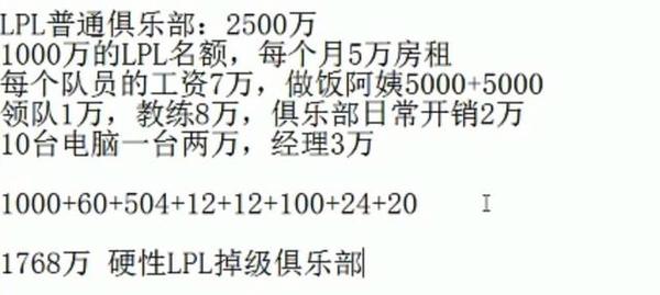 “电竞大嘴巴”五五开爱在自己直播中爆料已经成为习惯,近日,他又进行了一波关于现在LPL以及LSPL的日常开销的爆料。五五开表示,想要做LSPL俱乐部的身价起码要有3000W,而想做LPL俱乐部,最起码要有10亿才能玩得动。 关于LSPL最低配俱乐部的花销:200万的LSPL名额、一个月2W的房租,每个队员1W的工资,做饭阿姨5000一个月的工资,领队5000,经理1W,俱乐部日常开销1个月1W,而当这些转化为一年的开销之后则是需要344万一年。 关于LPL的最低俱乐部的花销:1000万的LPL名额、一个月5W的房租,每个队员7W的工资(平均工资),做饭阿姨5000一个月的工资(因为有韩援一般有两个厨师),领队1W,经理3W,教练8W,俱乐部日常开销1个月2W,而当这些转化为一年的开销之后则是需要1768万之多,而五五开直言这还是一支在LPL要掉级的配置! 关于LPL的保级或者中游些的俱乐部的花销:1000万的LPL名额、一个月5W的房租,每个队员500W(挖一个队员,转会费等),做饭阿姨5000一个月的工资(因为有韩援一般有两个厨师),领队1W,经理3W,教练8W,俱乐部日常开销1个月4W,顶级俱乐部起码一年的花销则是在四千万起。 在这其中,五五开更是谈到了几位知名选手的价位,虽然没有明言,却在旁边的计算器打出了包括UZI,Imp,小花生的价格,UZI5000W,Imp600W,小花生900W。 接下来五五开又说到了关于俱乐部的盈利模式,正当观众都在好奇俱乐部是如何盈利的时候,五五开告诉大家俱乐部没有盈利模式,唯一的盈利模式但可以说是老板的盈利模式就是卖队员还有卖掉LPL或是LSPL的名额以此来获利,国内的俱乐部几乎都是在亏钱,唯一可能做到没有亏钱的就是EDG俱乐部,因为他们运营的比较好,可能做到了收支平衡。 最后五五开也是认为,想要做LSPL俱乐部的身价起码要有3000W,而想做LPL俱乐部,最起码要有10亿才能玩得动。 |