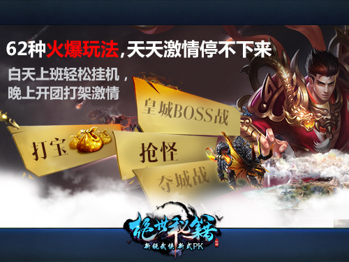 新锐武侠,新式PK,2016年贺岁新游《绝世秘籍》将于12月28日震撼开启不删档首测,三年磨砺,一朝亮剑。游戏以“玩家自创隐藏职业”、“无经验升级”、“回归原始PK时代”等诸多玩法为主打特色,在技术内测期间就深受广大玩家喜爱。此次不删档首测,官方将发放72万元现金红包,在Q群和微信群玩家都可以100%抢到,心动不如行动,12月28日让我们一次来加入崭新的江湖吧! 开测时间:12月28日19:00 【特色一:玩家自创隐藏职业 决战12.28首测】 《绝世秘籍》首创的“隐藏职业”系统,突破传统网游的职业固有模式,玩家可以通过在游戏内收集武林秘籍的“书页”,然后创造出一个属于自己的全新隐藏职业,并且拥有一套独一无二的战斗技能。隐藏职业系统的出现,大大增加了游戏后期的可玩性和职业探索性,让玩家亲自体验一把当主策划的感觉,自己DIY自己喜欢的职业。在《绝世秘籍》中,每一个隐藏职业配套着不同的战斗技能和属性,让战局变得扑朔迷离,让PK变得瞬息万变,你永远都不知道,站在你面前的对手,拥有着怎样的战斗能力。江湖,就是这般凶险与激情! 【特色二:无经验升级模式 休闲党的游戏福音】 玩网游太累?上班完全没有时间?《绝世秘籍》的“江湖升级塔”系统,玩家进入塔内每打败一个怪物,就可以直接升一级,等级不再是玩家玩游戏的枷锁与负担。后进游戏的玩家,通过江湖升级塔,也可以快速跟上当前服务器的主流等级,快速融入游戏中,与家族其他玩家打成一片。这种全新的无经验升级模式,大大地减少了玩家升级的时间,让上班族和学生党彻底解放双手,不再为游戏升级耗时而烦恼。 【特色三:唯美武侠新江湖 重回经典PK时代】 唯美江湖,热血回归;侠骨柔情,浪迹天涯!《绝世秘籍》2D唯美画风,为你展现美轮美奂的新武侠世界,高山流水,亭台楼阁,宗派宫殿,巍巍峥嵘。玩家行走在游戏中,有如行走在淳朴的真实江湖一般。游戏追求的是直爽PK,讲究的是热血的团战,崇尚的是兄弟之间不灭的情怀,如果你有一腔仗剑天涯的江湖豪情,那就在12月28日一起来加入吧! 【特色四:董事长亲自发红包 玩家可直接提现】 本次《绝世秘籍》不删档首测,为了感恩广大玩家长期以来的支持与厚爱,游戏官方将在开服期间,发放高达72万元的现金红包。玩家只要加入官方Q群或登录游戏,就可以轻轻松松获得微信红包,由董事长亲自发放,100%可以一键提现。机不可失,失不再来,全民红包大回馈,你准备好了吗? 《绝世秘籍》12月28日震撼开启不删档首测,玩家自创隐藏职业,海量微信红包天天发,赶快一起来加入吧! 了解更多相关信息,请前往http://news.yzz.cn/ku/jsmj |