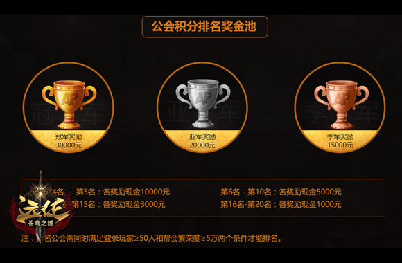 冰川网络旗下经典国战网游《远征》年度赛事——首届公会国战联赛,正在如火如荼地进行当中。目前公会国战联赛赛程已过半,即将进入最后的冲刺阶段,百家公会将为逾15万现金奖励再次发起冲击,万人国战就此展开激烈地角逐,百团大战激战正酣! 【首届公会联赛 现金大奖静候王者】 《远征》开启首届公会联赛,本次大赛分两大部分,分别是“公会积分赛”与“国战联赛排名”,玩家可同时参与两个赛事,并且两项奖励可同时获得。积分受玩家等级、公会活跃度、国战胜负关系等因素影响,奖金逾15万元,排名前20名的公会均可获得现金奖励! 【赛程已过半 鲲鹏区国战激战正酣】 公会争霸联赛率先在【鲲鹏】打响,目前“创世公会”以45000联赛积分排在首位,遥遥领先于二三四位的公会,但落后并非没有赶超机会,新服【碧游】的联赛也即将打响,抓住最后的机会奋力一搏,目前排名落后的公会不要灰心,逆势翻盘的机会依然存在! 【王者决战巅峰 23日新服即将开启】 《远征》将于12月23日盛大开启新服【碧游】,首届公会国战联赛也将诞生最强王者!恰逢年终资料片“苍穹之域”全面上线,新服【碧游】将势必掀起国战新风云,新国战玩法从根本上规避了强力公会之间强强联合的异常情况发生,玩家参与国战PK将更加激情! 《远征》全新资料片“苍穹之域”已全面上线,首届公会国战联赛也进入最后冲刺阶段,究竟哪支公会能够突出重围成就最强公会?我们拭目以待! 了解更多相关信息,请前往http://news.yzz.cn/ku/yuanz |