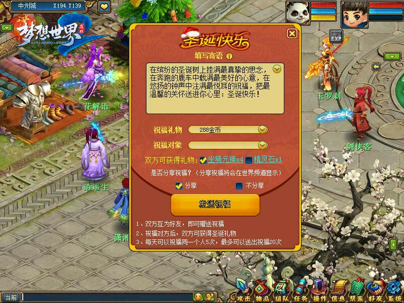 《梦想世界2》跨年庆典“江湖新梦”将于12月24日正式开启,双旦活动即将盛大登场!群雄将再次聚首,仗剑共赴中州城!同时,多益网络十周年礼包今日正式上线!快跟随小编一起来看看吧! 冰雪奇缘 铃铛响,驯鹿跑,雪花飘,圣诞到。今年的圣诞节,在清水湾、逐风原、云梦泽、月牙湾出现了各种雪族四处作乱,各位少侠可前往驱除他们,获取奖励的同时能够获得圣诞道具,集齐铃铛、蝴蝶结、圣诞树,能够在圣诞雪人处换取圣诞礼物盒。 圣诞小剧场 冬月飞雪,武林豪侠欢聚江湖,为了活跃圣诞气氛,活动期间每天在中州城会有圣诞小剧场,表演同时会有圣诞使者带来的小礼物,成功拾取即可获得丰厚奖励。 圣诞祝福 与友共欢庆,冬日添暖意。圣诞活动期间,玩家可以在圣诞雪人处向好友发送圣诞祝福,祝福对方的同时,双方都能获得道具奖励。 了解更多相关信息,请前往http://news.yzz.cn/ku/mxsj2/ |
