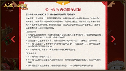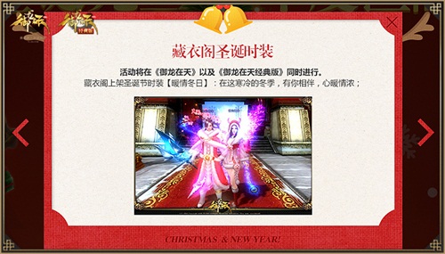 圣诞狂欢party,元旦跨年嗨皮,《御龙在天》双旦活动站正式上线!随着岁末的到来,《御龙在天》圣诞元旦?年度巨献品牌活动站全面开启,双节活动在这里“一网打尽”,所有御龙小伙伴可以在活动站了解游戏在圣诞、元旦期间的全部活动,送礼物、堆雪人、跨年夜……各种熟悉的“套路”,玩出不一样的花样!活动精彩内容现在为你揭晓! 圣诞狂欢 御花园缤纷活动来袭 随着双旦版本的更新,《御龙在天》将率先开启圣诞狂欢盛会。游戏王城银装素裹,漫天雪景装扮一新;军需镖车同步加入节日元素,变成麋鹿和雪橇的节日装饰。而所有的御龙小伙伴也可以在商城中购买圣诞节时装【暖情冬日】,为自己换上一套充满节日氛围的新衣服哦! 为了给大家制造更贴近生活的圣诞节体验,游戏在12月24日平安夜当天,开启“无硝烟”平安夜活动,抢镖活动改为圣诞运镖活动,并且于当晚休战,所有运镖玩家都将收获海量奖励哦!小伙伴们记得当天晚上去游戏内领取上好的福利! 此外,游戏还开启了“堆雪人竞赛”活动,将在《御龙在天》以及《御龙在天经典版》同时进行,所有40级以上玩家可以通过收集雪球一起来堆雪人,堆雪人可以获得各种圣诞专属奖励,奖励包括麋鹿的铃铛、镶嵌宝石、马匹技能书、紫装……还在等什么,快去王城组团堆起来! 元旦盛会 超级福利全民分享 有了圣诞的主题活动,元旦的超值回馈当然不会少!为迎接元旦的到来,《御龙在天》和《御龙在天经典版》直接红包走起,为所有玩家跨年“加薪”,每周各等级段个人工资提升一倍,每日活跃礼包奖励提升,《御龙在天》将增加普通强化剂、换镖令、坐骑原矿、前朝古币、精华碎片、龙涎香的产出,《御龙在天经典版》则增加淬炼宝石、绿装合成石、瞬移卷轴、免做令牌的产出! 装备淬炼一直是御龙族们最为关注的,说好了元旦送回馈,淬炼升星的相关福利自然也将名列其中!福利1:王城通用兑换大使处新增:中等淬炼宝石和金子兑换8星、11星、12星限时限次保星符;限时限量一定不要错过!福利2:将同时增加12星套和15星套小星套的伤害增加和伤害豁免数值。《御龙在天》中还在为战力担忧的小伙伴们,何不趁此送升星福利之际,火速行动起来! 出来新年“加薪”计划和岁末升星福利之外,根据御龙往年的传统,全民福利必然力度不减。在2016年12月22日-2017年1月3日23:59:59期间,40级以上玩家前往王城NPC“元旦感恩大使 ”处,每日可领取元旦感恩大礼——“贺岁百宝囊”2份,开启有机会获得飞马、熊猫绒绒等大礼。御龙族们快去问候“元旦感恩大使”! 福利不停战势不停 2017开门红! 除了圣诞、元旦的特色福利外,游戏内全新上线各类好玩的新活动: 1、全新上线的游戏玩法——“木牛流马”。年关将至,为加强国力,调动国民积极性,诸葛亮将绝密机关制造书——“木牛流马”流传于世,第一批制造出来的木牛流马将被用于系统国运,每天于系统国运22点,有镖局的国家将自动从镖局发出木牛流马(不管镖局是否开启),期间运输物资,本国运送成功则镖局直接获得银子收益,而敌国可以击毁木流牛马来获得军需物资!全新“木牛流马”活动将在《御龙在天》以及《御龙在天经典版》同时进行,所有玩家都可以在活动期间参与木牛流马的守卫战! 2、游戏内开启鲜花榜,本活动同样是在《御龙在天》以及《御龙在天经典版》同时进行。 2016年12月24日0:00-2017年1月2日23:30期间,御龙族们可以为游戏内的好友广送鲜花,也可以邀请好友为你送花,最终凭借超高人气值率先获得指定鲜花数的玩家,将获得各种专属装扮和道具奖励! 3、新一季的家族争霸赛。为了增强游戏在新年里的热闹气氛,双旦新版本将开启家族争霸赛活动,所有家族可以在周二、周五报名参加。所有家族的成员可以一起相约到游戏中,通过一场轰轰烈烈的家族战,来和游戏中的好朋友们一起过新年、抢豪礼,活动将于2017年初开启,敬请期待! 圣诞狂欢惊喜不断,元旦盛会欢乐不止,《御龙在天》及《御龙在天经典版》联袂献礼,多重活动诚意满满。十四重福利集结上线,全面涵盖战斗、休闲、福利三大维度!新春巨献,给你一份超级福利,御龙族们,千万不要错过哦! 了解更多相关信息,请前往http://ylzt.yzz.cn/ |