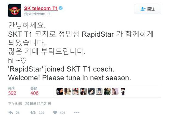 《英雄联盟》SKT战队昨天在官方推特上宣布,他们的英雄联盟分部将引进一名新的教练,RapidStar郑明成。 “粉丝们,你们好。RapidStar将加入SKT T1战队担任教练,欢迎他的到来!敬请关注我们下个赛季的表现。” RapidStar在韩服开设之初就接触到英雄联盟,与Azubu Frost战队成为当时韩国最强的英雄联盟队伍,被授予2012韩国电竞大奖最强中单选手。在S2全球总决赛中1-3输给了TPA战队,拿到了世界亚军,其后RapidStar在CJ战队效力至2014年退役。退役之后的RapidStar加入了EDG战队担任教练,直到2016年12月才离开。 SKT战队在休赛期间保留了他们的主力教练组L.I.E.S和Kkoma,RapidStar将代替离去的PoohManDu负责日常工作。 |