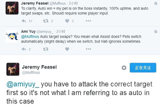 不久之前,《魔兽世界》设计师曾经表示兽王猎的哈提智商BUG暂时无法解决,这一说法也遭到了无数猎人玩家不满。不过在昨天却突然在推特上改了口,下面让我们一起看看设计师是怎么说的。 玩家:我希望哈提会是更有响应性的。我的主宠一直冲向目标但是哈提却落在后面吃尾气。 设计师:这个(BUG)看起来可以解决,之后会讨论。 玩家:我仍然惊讶于那些新的宠物种类上线后居然全都没特殊能力技能!(注:比如7.0新加入的机械,牦牛等) 设计师:没错,被动技能的置换方案不会在他们(特殊能力技能)被移除前加入,此时正在致力于此,谢谢! 前两天设计师提到了一个Auto win,既表示:自动,智能,自动获胜的词,并提到宠物在副本战斗中不可能Auto-win。今天他对这个词做了个解释。 设计师:澄清一下,Auto win=我的宠物会立刻冲向BOSS,100%的覆盖时间,还有全自动的目标切换,等等。(这些)本应该需要玩家自己输入(按键)的! 玩家吐槽:自动切换目标?你是说协助模式么?当我们切换的时候宠物们也会自动切换(稍有些延迟),但是哈提有时候会完全无视啊! 设计师:你必须先攻击正确的目标啊,所以这不是我提到的自动的例子。 |