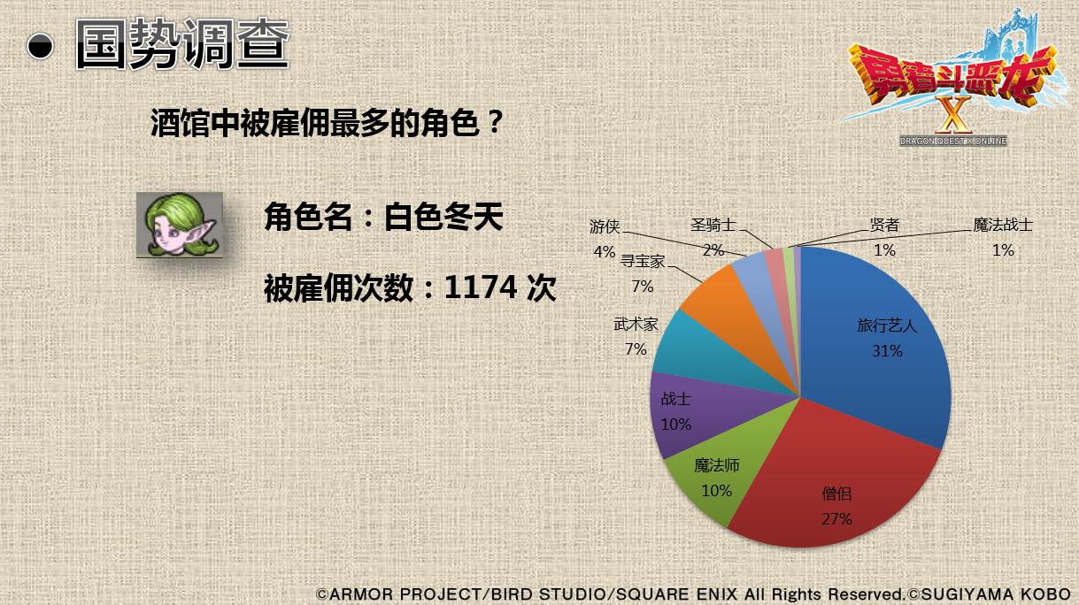 史克威尔艾尼克斯出品的国民级RPG网游《勇者斗恶龙X》公布最新“国势数据报告”,首次披露了游戏中职业现状以及最近开放住宅区后的购买情况。同时,盛大游戏也开放了《勇者斗恶龙X》免费试玩活动。 《勇者斗恶龙X》开放性测试以来,国服也经过了数个小版本的更新,相继开放了贤者、魔法战士、战斗大师等新职业,并于近期开放了住宅区房屋系统,获得了玩家们的追捧。至此,游戏世界中也产生了诸多有趣的数据,让我们先了解下(数据采集于2016年12月19日): 《勇者斗恶龙X》是个职业丰富的游戏,每个职业都是游戏大家庭的组成部分,在最新的数据中,战士和僧侣依然占据职业比例最多,职业平均等级最高的是新开放的魔法战士。 (具体数据如下比例:战士18%、僧侣15%、旅行艺人14%、寻宝家12%、武术家12%、魔法师9%、魔法战士7%、圣骑士5%、游侠5%、贤者3%) 《勇者斗恶龙X》作为DQ系列首款网游作品,在社交方面做了很大的突破,独创了酒馆的好友支援系统,简单说就是你可以雇佣离线玩家帮你一起做任务打BOSS,或者你下线时被他人雇佣。开测以来,酒馆雇佣的玩家被雇佣次数多达1174次,其雇主也分布各个职业。 近期,《勇者斗恶龙X》还开放了房屋住宅系统,玩家可以在住宅区购买自己喜欢的地段建造房屋,该系统开放以来就深受玩家追捧,目前已成功出售的小型土地701块,中型土地130块,官方也开放了住宅存街区扩展! “角色扮演”的乐趣就是在于玩家是否能真正地沉浸到游戏世界之中,从这些数据,我们就可以看出《勇者斗恶龙X》完美的诠释了这一点,玩家们在游戏里真正扮演属于自己的角色。现在,盛大游戏也开放了免费试玩机制,喜欢日系RPG的玩家们千万不要错过! ·免费试玩账号可以游玩的内容包括: 1、人类部分的伊甸村。 2、转生后的新手村村内。 注意事项: ·免费试玩账号只能进入免费试玩线路:世界08 ·正式玩家不处于同一线路中,无法面对面交流。 ·免费试玩的内容到转生后的新手村为止。 ·尝试出村时会提示错误。 ·如需继续游玩之后的内容,或与正式账号的玩家进行交互,请购买冒险者登陆证,并重新登录游戏,选择世界01或世界02后即可正常游戏。 了解更多相关信息,请前往http://news.yzz.cn/ku/yzdelx/ |