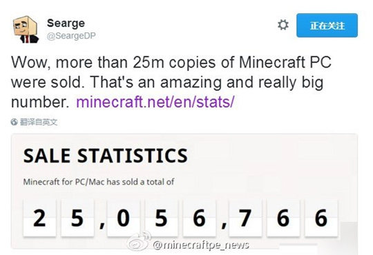 近日,《我的世界》开发者Michael Stoyke在推特上公布了游戏的总销量。根据他公布的数据显示,《我的世界》PC版已经卖出2500万份,移动版游戏也登陆了各大平台。 《我的世界》自发售后人气就一直居高不下,此前还公布了全平台累计销量破1亿的消息,成为了全球游戏史上的第二大游戏(仅次于《俄罗斯方块》)。近日,游戏开发者Michael Stoyke还在推特上公布了《我的世界》PC版销量,已经突破2500万份。 任何游戏销量特别高的话都会让人印象深刻,而《我的世界》这款游戏似乎是每一个玩家包括他的妈妈都会买的游戏,这款游戏仍在火热。 不可思议,PC版《我的世界》卖出了2500万份。太强了,这个数量惊呆了。 — Searge (@SeargeDP) January 3, 2017 《我的世界》是一款3D像素风沙盒游戏,在教育、公益等多个领域引起巨大反响,其影响力早已超越游戏本身,也颠覆了人们对于游戏“不学无术”的刻板印象。今年520网易游戏热爱者发布会,网易宣布与微软公司、Mojang工作室达成合作,将《我的世界》带入中国。预计2017年上半年开启测试。 |