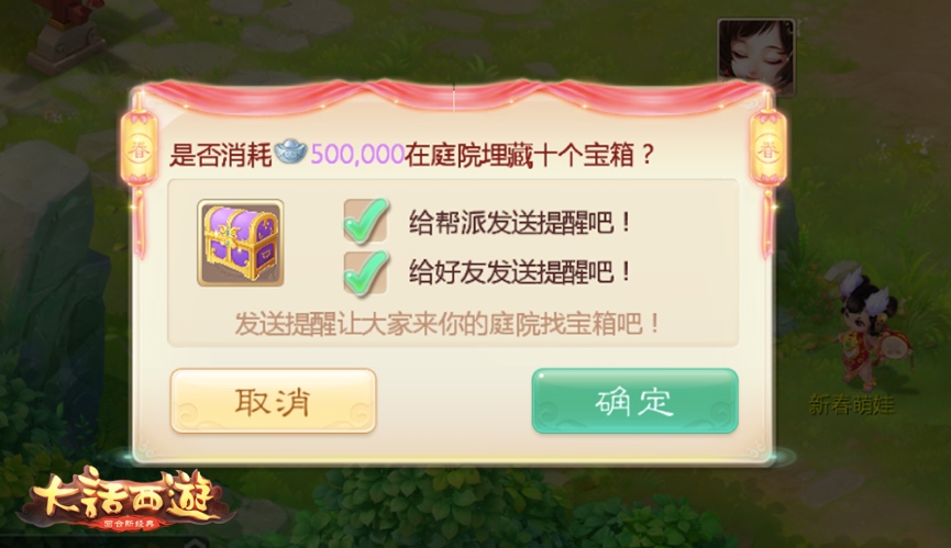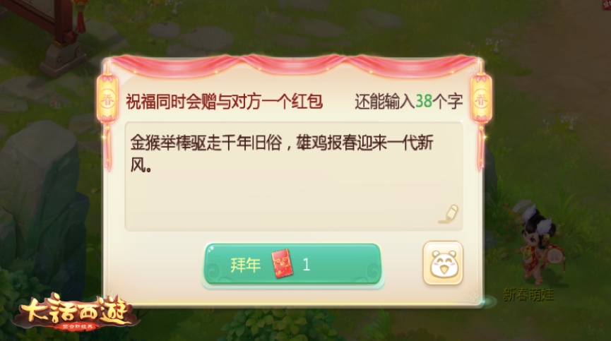 金鸡报喜辞旧岁,大话团圆喜迎春!随着元旦狂欢的结束,全民同庆的鸡年春节也将到来,作为《大话西游》手游岁末狂欢季的又一福利内容,官方为玩家准备了年味十足的喜庆春节游戏活动,“新春祝福”、“新春家宴”、“除旧驱妖”、“新春主题红包”等多重趣味春节游戏玩法将火热上线,丰厚重磅玩家福利送不停! 辞旧迎新贺鸡年 新春祝福活动即将开启 为了迎接新年的到来,2017年1月5日8:00- 1月7日5:00期间,玩家可在情系今生、相聚长安、紫陌红尘三个测试服率先体验“走亲访友”、“藏宝迎宾”、“烟花献福”三大新春祝福活动。 当玩家在角色等级达到50级,即可登陆庭院场景,搜寻“新春福娃”NPC,除了可以埋下宝箱邀请好友来寻宝外(好友活跃度达到第一档,即可领取“小铲子”挖宝),更可购买喜庆缤纷的烟花邀好友观赏!此外,玩家还可前往长安城“杂货店老板”NPC处购买新年红包,将红包赠予好友并送出温馨的鸡年祝福,邀他们一同庆贺新春佳节的到来! (藏宝迎宾) (藏宝迎宾) (烟花献福) (走亲访友) (走亲访友) 除此之外,传说中的“鸡驴大神”将在春节期间游历大话江湖的名山大川等待有缘人,并为所有玩家送上新年祝福,想要和鸡驴大神邂逅的玩家一定要抓紧了!新春佳节之际,玩家可参与众多春节任务,收集“行运符碎片”兑换日常任务错过的经验(限1月5日8:00-1月6日5:00春节活动期间有上线的玩家可参与兑换)。同时,玩家收集碎片合成“新年行运符”,更可与“鸡驴大神”相遇获得价值非凡的游戏奖励! (鸡驴大神npc) (“行运符碎片”兑换失去经验值) (“新年行运符”抽奖) 喜迎新年共团圆 新春家宴玩法火热来袭 除了节日氛围浓厚的春节祝福活动之外,在此鸡年春节即将到来之际,官方还推出了“新春家宴”趣味节日玩法。活动期间,玩家登陆游戏参与庭院、帮派“新春家宴”任务(两类任务奖励次数共享),通过日常活动筹集食材,当累计足够食材后,便可通过长安城“酒店老板”NPC学习、制作菜品参与新春家宴,赢取丰厚游戏奖励(每日首次参与“新春家宴”活动才可获奖励)。 (家宴菜品学习、制作) (参与帮派家宴) 降妖除魔辞旧岁 除旧驱妖玩法即将上线 在这辞旧迎新之际,“除旧驱妖”春节福利玩法也将与玩家见面。玩家将通过长安城“新春福娃”NPC匹配参与体验。在福娃训练场中,玩家将随机划分到道士或小妖阵营,道士可利用“火眼金睛”探测小妖,而小妖也可释放晦气迷惑道士。诸位玩家一定要注意合理释放技能以及同阵营玩家配合,才能抢到“限时强化宝箱”并顺利击败对手,赢取丰厚游戏奖励,共度一个祥和团圆的新春佳节! (“除旧驱妖”玩法说明) (除旧驱妖道士) 鸡年大吉福满堂 主题红包藏宝图多重福利玩法来袭 鸡年将至,在这普天欢庆的时刻,《大话西游》手游也将为玩家准备了福利丰厚的新年主题红包玩法,邀玩家开开心心过个好年!参与帮派、世界红包玩法,除了为其他玩家送上新年祝福外,更有几率赢取数量丰厚的“行运符碎片”,抢先与鸡驴大神邂逅,收获更为珍贵的游戏奖励! (新年主题红包) (世界红包) 春节期间,极具节日氛围的“新春宝图任务”也将火热来袭。玩家参与日常“宝图任务”掉落的藏宝图将是特殊的新春藏宝图。根据宝图路线,玩家将有机会挖出双倍的游戏奖励,共度这一新春时刻!此外,嘉年华活动中玩家特别熟悉的捉迷藏任务,也将新增冰天雪地场景,相信在银装素裹的世界里躲猫猫也是别有一番乐趣哟! (新春捉迷藏) 新春佳节即将到来,《大话西游》手游为玩家准备了喜庆的春节游戏活动,除了“新春家宴”、“除旧驱妖”、“走亲访友”等系列趣味十足的新春节日玩法即将上线外,诸多特色游戏玩法也将迎来更新,多重重磅游戏奖励邀玩家来拿!更多新春活动信息,请关注《大话西游》手游。 了解更多相关信息,请前往http://xy2.yzz.cn/sy/ |