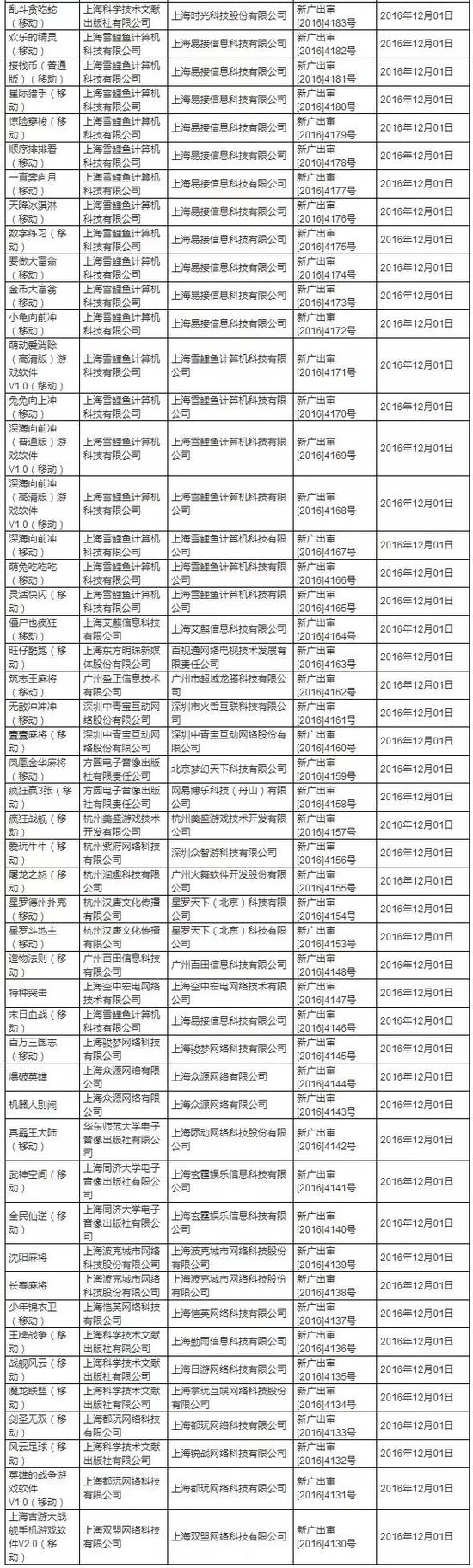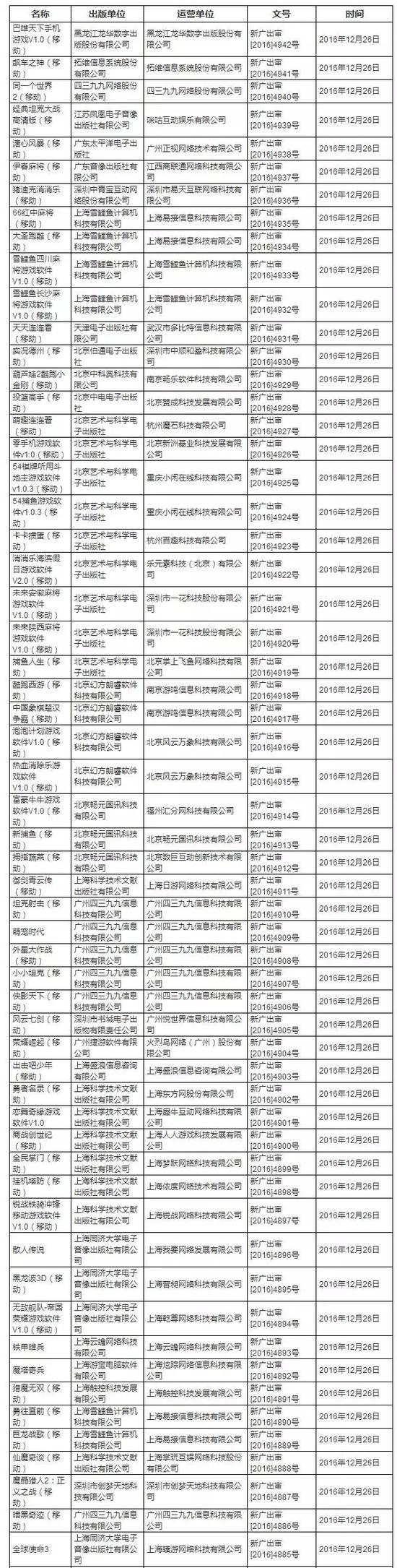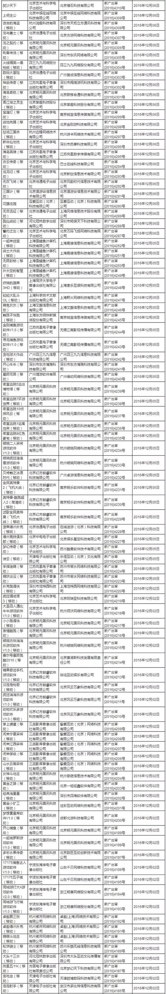 1月4日,广电总局公布了在12月份通过审批的游戏名单,一共有702款游戏通过审批获得了版号,其中有680款手游。从7月份审批公告的发出到目前为止,腾讯共有97款游戏过审,其中手游18款;网易38款游戏过审,其中手游为27款。 除此之外,本次12月名单中,腾讯、网易等知名游戏厂商皆有一部分过审的游戏并没有正式上线,可以从这些游戏中看出2017年这些游戏大厂的计划。在12月版号公布结果中,“七大类”游戏依旧占多数,但MMO类和ARPG类所占比例明显增加,其中网易的《百将行》、《烽火王师》也已经通过审批,中青宝的《有妖气三国》以及其他休闲棋牌游戏也通过了审批。 虽然2016的游戏审批已经全数公布,但是依旧有很多游戏并没有拿到版号,只不过一旦进入了版号审核流程,虽然没有版号但是并不会遭到强制性的下架。对于旧有的游戏来说并不会死得那么快,而在2017年新的游戏基本上都需要版号才能够正常的上线公测。 以下是12月1日至26日审批信息名单: |