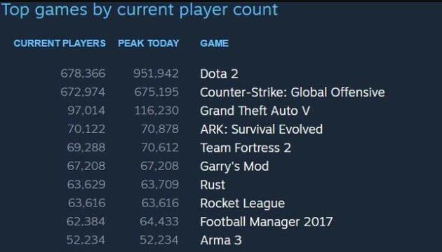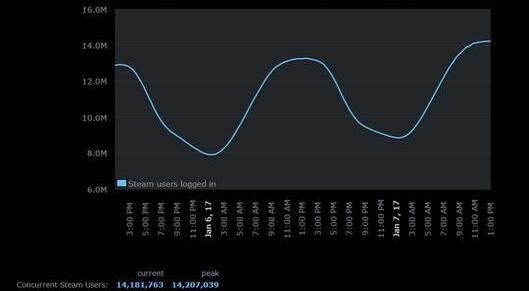 1月9日消息,此前Steam同时在线人数达到1200万创下新高,而这一数字在2017新年的几天之后就再次打破。据1月7日数据显示,Steam同时在线人数达到1420万人,一举刷新纪录。 据悉,在Steam平台同时在线1420万人的这个峰值到来时,在线人数前三位的游戏分别是DOTA2、CSGO和GTA5。在上周末,不知身在中国的你是否成为了这1420万分之一呢? 在不久前的各种年度盘点中,Steam在2016年的游戏数量及销售数据也遭曝光。这一年,共计有5245款游戏在Steam上发售,这一数字也是Steam史上新高,仅今年12月就有588款游戏在Steam上架。 Steam数据统计网站Steamspy通过对Steam玩家信息页面进行统计分析的结果显示,在2016年Steam共有3.7亿份游戏找到了新家,总销售额则来到了34.7亿美元,其主要增长点来自于亚洲,特别是中国。 2017年,Steam是否还会迎来一个新的高峰呢?让我们拭目以待。 |