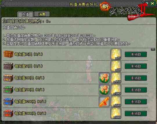 2017年1月12日,《新剑网2》系列游戏春节版本全面上线,与您共庆新年,引爆2017!春节五大活动喜迎新年,全新改版的1月充值放送豪礼,还有VIP年度回馈、东皇凤鸣装备兑换等一系列玩法,快来看看吧,总有一款适合你! 【五大活动 喜迎新春】 喜迎新春,浪漫情人,双节连过!新春大礼包、新春豪礼、年夜饭压岁钱火爆开启,情人节活动、欢乐幸运匣情暖新春,更有王者归来福利欢迎各位侠士前来参与。 活动时间:1月12日9:00-2月15日23:00 详情请见:http://jx2.xoyo.com/ibnew/1095655 【开年充值 全新来袭】 鸡年大吉,回馈升级!为了让玩家享有更多的福利,2017年1月12日起,月度充值促销活动全面调整,充值福利全部回馈给充值玩家,还新增了消耗奖励,更多好礼,尽在开年充值活动! 充值时间:2017年1月12日9:00-2017年2月22日23:00 详情请见:http://jx2.xoyo.com/ibnew/1095730 【年度回馈 只因有你】 辞旧迎新,豪礼将至,侠士们期待已久的2016年度VIP回馈即将开启!《新剑网2》系列游戏已走过十一个年头,我们特意为各位大侠准备飘逸雅致的仙鹤坐骑等豪礼,感谢你们一路走来的支持和喜爱!超豪华大礼包唾手可得,非凡特权体验,只为VIP的你! 充值VIP回馈奖励领取时间:2017年1月12日9:00-2017年2月15日23:00 【东皇凤鸣 战场装备】 1月12日维护后,将开放东皇凤鸣战场装备的兑换,各位侠士可以前往萧远楼、赵延年处兑换。 (截图仅供参考,实际请以游戏内为准) 了解更多相关信息,请前往http://news.yzz.cn/ku/xjw2/ |