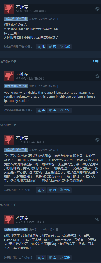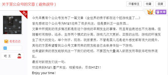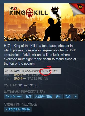 近日,一篇关于游戏《H1Z1》的文章成为了朋友圈的爆款,一时间引起了各路玩家的注意,并被大量转发。 受这篇文章的影响,也就在一夜之间,《H1Z1: King of the Kill》(即“大逃杀”版)就迅速上升至Steam国区热销榜第二名。考虑到排名第一的是一款桌面应用,《H1Z1: King of the Kill》目前已经成为国区第一热销游戏。 这篇名为《全世界的喷子都在这个脏游戏里了,老外不会说中文“草你吗”简直就没法活》的文章,内容大致描述了各国玩家在H1Z1里对骂的故事。文章中列举了大量例子,讲述中国玩家如何组队制霸游戏,以及外国人企图反抗却屡遭打压,最后被迫学会了中国经典国骂“SAO NI MA”。 而常年占据Steam热销榜前十的《H1Z1》,其实一直都是个还在“抢先体验”阶段的游戏,目前并未发售正式版。但它以丛林法则为基础的规则,以及很高的自由度,让大量玩家沉迷其中。 值得注意的是,这款游戏在Steam的整体评价并不高,只有65%。而主要原因之一是,国区玩家刷了大量的差评,大部分都是因为官方封锁了大陆的IP,玩家如果不使用代理服务器的话将无法登陆。而另一方面,这款游戏并未停止在国区销售,并且还自带中文。国区玩家固然对这款游戏有很多不满,但它的热度并未因此降低。 排名靠前的评价均为差评,理由大多与锁大陆IP有关 另外,由于大量新人的涌入,百度贴吧也出现了很多老玩家的抱怨。为了避免新人被这篇文章带偏,贴吧吧主老老达达专门发了一个置顶帖,详细解释了一下这篇文章中存在的问题。 《H1Z1》是一款由Daybreak公司开发的生存沙盒游戏,于2015年在PS4与Steam平台登录。游戏故事背景发生在丧尸病毒爆发的15年之后,玩家需要扮演劫后幸存者,在城市与荒野间设法生存下去。 |