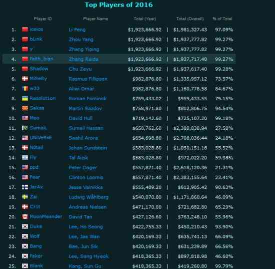 2016年对中国DOTA来说依旧是赢得荣耀的一年,而LOL仍然惨淡。2016年,Wings赢下Ti6晋升获得奖金最高的战队,而在英雄联盟方面仍是韩国LCK一家独大,拿下《英雄联盟》七成奖金。 电竞市场每年都在扩大,对于2016年而言,传统体育队伍进军和大型赛事奖金提升是最大的影响,随着观众和队伍壮大,不少电竞赛事都以高额的奖金吸引玩家入场。据电竞媒体esportsearnings统计,去年全球电竞赛事共颁发了9320万美元奖金,年度最高奖金的5个电竞赛事分别是《Dota2》、《CSGO》、《英雄联盟》、《风暴英雄》和《使命召唤》。其中《Dota2》颁发了3725万美元的奖金,成为了电竞史上目前比赛奖金最高的赛事。 《英雄联盟》在120场赛事中颁发了1027万美元,其中奖金池最高的赛事为2016全球总决赛,高达507万美元,最终冠军花落SKT战队,队伍六人拿走了202万美金,而整个S6全球总决赛的86名参赛选手中,有51名选手来自韩国,他们合计拿走了350万美元。此外SKT战队也是LOL2016年夺冠最多的队伍,他们还拿下了LCK春季赛冠军、IEM世界锦标赛冠军和MSI季中邀请赛冠军。 在全球范围的电竞战队中,来自中国的Wings战队夺得了962万美元,成为年度收入最高的队伍,他们获得了TI6冠军。而欧美豪门DIG、EG、FNC和Liquid战队位列前五名,SKT战队以273万美元位居第七名。 在选手个人的全年奖金收入榜单中,Wings战队五人是排名前47名中仅有的5名中国人,他们包揽了榜单前五。SKT战队首发五人平均42万美元位列21-25名,Bengi由于登场次数较少,以36万排在38名,至此Faker的累积总奖金已经高达89.8万美元,成为LOL选手之最。 |