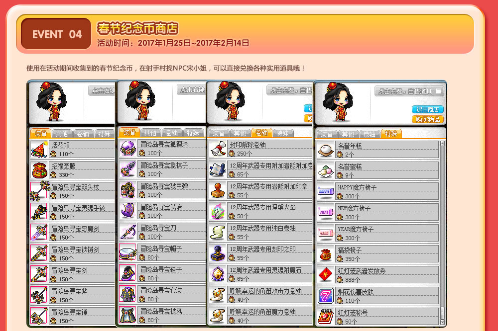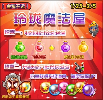新春将至,各方福利狂卷而来,管你是富强、和谐还是敬业福,盛大游戏主动出击,福利活动火热来袭,良辰美景时刻,想要领福的小伙伴可千万不要错过!!! 【传奇世界】穿新装打年兽《传奇世界》新年福利享不停 作为中国的传统节日,在春节期间有许多传统习俗。今年春节,《传奇世界》将春节传统习俗带到游戏中,邀请所有玩家到中州大陆共度佳节。新春非值守签到火热进行中,过年走亲访友也不会耽误大家参与新春活动,手机或电脑访问活动页面签到即可获得项目组送上的新年贺礼。新年穿新衣,更换全新战神级装备、新春面具,以崭新的面貌迎接新年。放烟花是春节必不可少的习俗,邀请好友一同点燃烟花,为新的一年祈福。新春年兽大作战,以同伴一起击退捣乱的年兽,还能获得丰厚的新年礼物。另外,贴春联也是春节期间家家户户必做的习俗,中州城也将在春节期间张贴春联,春联内容向广大玩家征集,想让自己的作品高高挂在中州城门上么?将春联内容发送到邮箱:jianyi@woool.com即有机会入选哦! 【冒险岛】绝对任性切勿错过 新春狂赠绝版道具 新春拿好礼 新春佳节普天同庆,在广大岛民小伙伴的齐心协力下,成功开启M-DAY全服福利活动!酷炫服饰、皇家卡、强化道具?通通免费送,满足你的多样需求! 每周二、四、六,通过活动提示直接领取。 兑换礼上礼 新春期间,有多多的线上,参加第一声问候、小游戏大赛、绚烂烟花等多个活动都可以收集春节纪念币,找到NPC即可兑换各种实用道具。更有新年椅子等你兑换。 【热血传奇】六大春节在线活动,各种红包等你来拿! 《热血传奇》为传奇玩家准备了丰富好玩的线上活动陪您一起过大年!“怪物献红包”、“种植平安树”、“新年红包来就送”、“新春签到送好礼”、“套装升级石礼包”、“元宵答题”六大春节在线活动,各种红包等你来拿!1.80经典版跨服战第一期本周三最后一场,奖励丰厚千万不要错过! 最受期待的《热血传奇》2017农历新年贺岁套装闪耀登场!赢战2017,金凤、灵凤、神凤每套新装都由武器,衣服,首饰三个部分组成。炫酷的外观,华丽的特效,霸道的属性,带你感受极致PK!《热血传奇》祝所有传奇玩家新年快乐,生活幸福,平安喜乐,快乐游戏! 【龙之谷】这个春节不孤单!《龙之谷》海量新年活动来袭 《龙之谷》端游新春献礼,海量福利活动齐上阵!Bingo活动考验你的RP值,幸运数字连连看,连成一线奖励轻松拿!通过Bingo活动获取2017新年纪念明信片,各种实用道具奖励都能拿哟,还能兑换小呆鸡帽子,金蛋银蛋咯咯哒!通关新春活动年夜饭关卡,跟随小妖精主厨开启幸运宝箱,金币、道具还有春节红包让你欢欢喜喜过大年!通过开启宝箱可以获得背包交换券,与帽子配套的小呆鸡背包也非常值得你的入手!另外还有冲破黑暗宴会厅硬核模式,赢取93A级金属板袋子的超值活动。通关趣味与挑战二合一的创造者巢穴,即可使用通关道具兑换特殊称号、精灵、三件套、坐骑等奖励!参与软萌即是正义——周边抱枕征集活动,有机会将自己的作品纳入官方周边哦!随着新版本的到来,深海海龙巢穴也与大家见面,参与绑定老用户、邀请新用户的“海龙归来,燃战结盟”活动,即可获得小米智能电视、珍贵魔法师周边、雷蛇鼠标以及多重游戏道具奖励!应景的NPC开年送好礼活动也来啦,使用物品“炸弹”威胁可爱的NPC们,他们会向你送出超值新春好礼!灿烂的阿尔杰塔戒指,93A+418最终金属板、受祝福的武器交换券以及受祝福的勇士三件套和永久技能升级纹章等都有机会拿到!这个春节不孤单,《龙之谷》海量新年活动等你加入,新版本“燃战·守护”,邀你共度新春佳节! 【泡泡堂】吉星高照大联欢 金鸡开运—黑妞的逆袭 你最喜欢泡泡堂中哪位角色呢,是泡泡堂资历最深的蓝妹妹,还是女神月野兔,或是可爱的邻家洋葱妹妹?还有一位女性角色一直被大家忽略,谁都不知道她从哪里来,她什么时候出现,但是她一直守护着泡泡村,黑妞是个害羞的姑娘,帽子底下藏着一对大耳朵,为了怕吓到别的小伙伴,她都一直戴着帽子,直到有一天,泡泡村的小伙伴都知道了这个秘密, 她就大方的摘掉了帽子,变成了一个性格开朗的黑妞,大家都趁她为超级黑妞!自超级小强之后,超级家族再添一名新成员——超级黑妞。这一次,超级黑妞不仅以超强能力逆袭,更是变身妩媚猫少女,泡泡堂女神角色再添一人!快来荣耀VIP卡中合成吧! 金鸡开运—玲珑魔法屋 新年到,怎么能没有玩家最喜欢的任务呢~六彩玲珑泡泡自2015年首次推出后,再次出现在泡泡堂的魔法屋中。泡泡堂首个六态泡泡,集经典漂亮特别于一身,怎么能不拥有一个呢~还有还有,据说有海量新品一起在春节期间加盟魔法屋哦,猜猜看又会有什么神秘道具出现吧! |