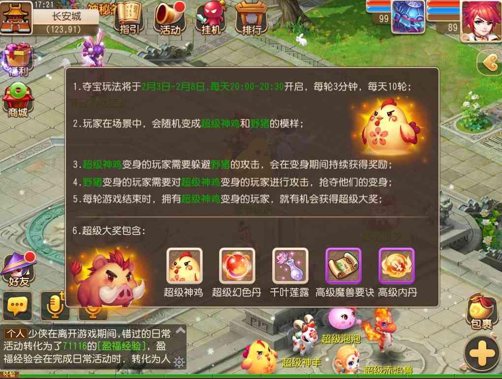 随着《梦幻西游》手游新春活动逐渐临近尾声,萌萌的咕咕财神也将返回天庭,但是,《梦幻西游》手游玩家的狂欢并不会就此终结!从2月3日~2月8日,咕咕财神邀请每一个等级≥40级的玩家前来参与神鸡夺宝活动,在这个春节,将海量好礼抱回家! 萌鸡送福,咕咕财神放大招 自从下凡以来,咕咕财神凭借着萌萌的外型、古灵精怪的性情受到了众多玩家的喜爱。无论是在玩家的家中,还是在各大城市的地标建筑旁,无数玩家都拿起自己的手机,召唤出咕咕财神,领取它所赠送的游戏红包。在此期间,也有不少玩家在社交平台晒出自己的百万银两、十万金币红包大奖,为咕咕财神俘获更多人气。但是咕咕财神的魅力仅止于此么?随着它回归天庭日期的临近,它又准备了“大招”,要将其压箱底的宝贝赠与有缘人。 神鸡夺宝,趣味变身乐翻天 2月3日,全新神鸡夺宝活动正式开启!这一由咕咕财神亲自主持的活动,将在每天20:00~20:30开启。参与活动的玩家将进入活动场景之中,变身为超级神鸡或者野猪的模样。拥有超级神鸡造型的玩家需要躲避野猪的攻击,并在变身期间持续获得奖励,而获得野猪造型的玩家则需要对有超级神鸡造型的玩家发起攻击,抢夺他们的变身。在游戏结束时,拥有超级神鸡变身的玩家,就有机会获得超级大奖。在这一“你追我逃”的游戏中,谁才能笑到最后呢?让我们拭目以待吧! 福利送不停,海量好礼待君赏 作为咕咕财神回归天庭的告别秀,它也拿出了自己的无数珍贵秘宝,来犒赏那些在神鸡夺宝活动中,表现出色的玩家。在整个活动中,玩家将有机会获得超级幻色丹、千叶莲露、高级魔兽要诀、高级内丹等丰厚好礼,除此之外,更有可能将神兽超级神鸡带回家!想要与这位2017年新晋萌神来一次亲密接触的朋友,千万不要错过这一机会哦! 很快,《梦幻西游》手游神鸡夺宝活动就将开启。在这一全民狂欢之中,神兽超级神鸡也将选出自己所属意的主人。你,会获得它的青睐么?在整整七天的狂欢活动之中,答案就会揭晓! 《梦幻西游》手游介绍 国民手游,人人都玩!《梦幻西游》手游由梦幻西游金牌团队倾力打造,是一款Q版回合制MMORPG手游。上线至今,凭借Q版造型的可爱人物,浓郁古典风的精美场景和原汁原味的经典玩法,注册用户突破1亿。超高人气,引爆潮流,构筑属于亿万玩家的梦幻家园。 国民手游,梦幻西游,人人都玩,无处不在! 了解更多相关信息,请前往http://my.yzz.cn/ |