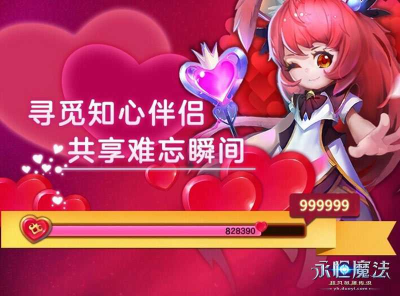 我心永恒,全城热恋!《永恒魔法》情人节活动“我心永恒”今日甜蜜开启,全新结婚玩法怦然上线!情人节将至,遇见怦然心动的那个TA,与TA并肩作战,又或者来一场举城羡慕的盛世婚礼,热恋风潮正在席卷而来!这个情人节,《永恒魔法》为每个玩家精心准备了四大活动,助你收获甜蜜爱恋,更有机会获得丰厚蜜月基金,让你大撒狗粮羡煞旁人! 《永恒魔法》游戏宣传视频 《永恒魔法》全职业视频 心有灵犀 匿名表白脱单大冒险 新年愿望里说好的“今年脱单”呢?情人节又到了,还打算一个人?很多话想说又开不了口?《永恒魔法》“脱单大冒险”助你传递心意吧!2月9日起,扫描活动二维码即可参与匿名表白,把你想说又开不了口的话悄悄告诉TA,有喜欢自己的人一定很幸福吧!活动期间,参与表白或接受表白的玩家均可获得《永恒魔法》情人节礼包,配对成功的玩家还能领取限量情侣大礼包,内含银币、幸运币、藏宝图、玫瑰花、精美情侣头像框等! 心心相印 丘比兔爱心大作战 情人节活动期间,“丘比兔”将化身爱情使者,向所有玩家悬赏散落在泰拉西亚上的爱心;当收集的爱心达到999999颗时,“丘比兔”将为各位冒险家解锁结婚玩法!玩家在游戏内完成规定任务即有机会获得爱心道具,以异性组队形式向“丘比兔”上交爱心材料,即可兑换随机奖励。奖励包括:钱币、符文、玩具、珍兽之灵、亲密度等;如果获得“丘比兔”的爱慕,还有机会让她跟随你冒险哦! 永结同心 结婚玩法甜蜜开启 《永恒魔法》结婚玩法即将开启!你将穿一身欧式婚礼服,与TA徐徐步入梦幻的婚礼中,接受全城的祝福,让甜蜜播撒全城! 心想事成 蜜月基金人人有礼 《永恒魔法》为每对永结同心的爱侣提供赢取蜜月基金的机会!玩家在游戏内完成结婚任务,并在活动页面上传游戏婚礼照片,即可获得一次蜜月抽奖机会。玩家邀请好友对婚礼图片进行点赞,1名好友点赞可增加10点人气值,所获人气值用于兑换额外抽奖次数。 关于永恒魔法 永恒魔法是多益网络2016年潜心研制的3D魔幻冒险网游,游戏打造了一个会呼吸的真实魔幻世界,六大职业角色伴你开启一段梦想与魔法的冒险之旅。在这里,热血战场,感受血火同燃的竞技乐趣;萌宠相伴,让你冒险之旅绝不孤单;绿色公平,极品装备随机掉落;拒绝单调,与知己好友轻松社交,来一场随心所欲的自由冒险。 了解更多相关信息,请前往http://news.yzz.cn/ku/shmf/ |