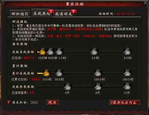 江湖儿女重聚首,与歌同行赢壕礼!《大话西游2经典版》五大福利活动邀你重出江湖,鎏金宝鉴(真爱版/分享版)、大话西游主角手办/音乐盒、回流尊享礼包、特殊称谓、BUFF加成等多种福利等你体验,更有老友积分可用于兑换神兵体验券、召唤兽技能等奖励!此外,新服【报春花】今日中午12点火热开启,虚席待君至! 福利1:邀请好友,抽各种好礼 活动期间,诸位玩家若累计成功邀请1位、3位、5位好友回归,可分别获得一次抽奖机会,有鸡驴获得鎏金宝鉴(真爱版/分享版)、大话西游主角手办/音乐盒、香火等多种奖励!此外,在老友积分兑换界面,可使用200积分兑换一次抽奖机会。 福利2:战友回归,享多种特权 活动期间,满足条件的回流玩家登陆可享受多种特权。 特权1:回流尊享礼包,内含神兵体验券、飞行器体验券、孔明灯、300W帮贡; 特权2:特殊称谓、萌宠变身、缤纷特效,男角色称谓为“哥回来了”,女角色称谓为“姐回来了”,玩家使用时造型将按角色性别分别改变为葫芦娃娃、如意娃娃; 特权三:在修罗任务、鬼王任务和天庭任务中,若队伍中有一人是回流玩家,则该队伍的玩家会得到BUFF加成; 特权4:与回流玩家组队挑战大雁塔、孤竹城、秘境寻踪或定心除魔等副本,队伍中其他玩家将有几率获得系统赠送的小礼物。 福利3:游戏在线,得海量经验 活动期间,游戏在线即可获得大量经验奖励,完成指定任务更可获得相应奖励。 满足以下条件均可领取奖励:每日在线10min、30min、1小时、3小时、5小时,活动期间累计在线10小时、30小时、100小时、150小时,连续登陆累计4天、8天、12天。 完成以下任务均可获得奖励:天降好礼200次、不计成败切磋3次、结交5个新朋友、累计在队伍频道发言30次、抢8次星魂、2次帮战、5次帮派任务、10场天梯比武、5场挑战任务、5次召唤兽比斗、1次帮派运镖、1次永劫之数任务,完成上述所有任务更有丰厚奖励相赠! 福利4:老友积分,换神兵套装 活动期间,诸位玩家与回流玩家一同完成天庭任务、鬼王任务、修罗任务、水陆大会、地宫挑战,即可获得老友积分(每天最多可获100分),可用于兑换神兵体验券、召唤兽技能等多种奖励。 福利5:整点刷怪,赢高级奖励 活动期间,每隔整点,傲来国、五指山、大唐边境三个地图中将出现怪物,其中地上会刷出20个造型随机的怪物,天上会刷新出5个飞行怪物,需要上飞行器才能攻击。诸位玩家可组队前往挑战,挑战成功即有机会获得高级物品奖励。 了解更多相关信息,请前往http://xy2.yzz.cn/ |