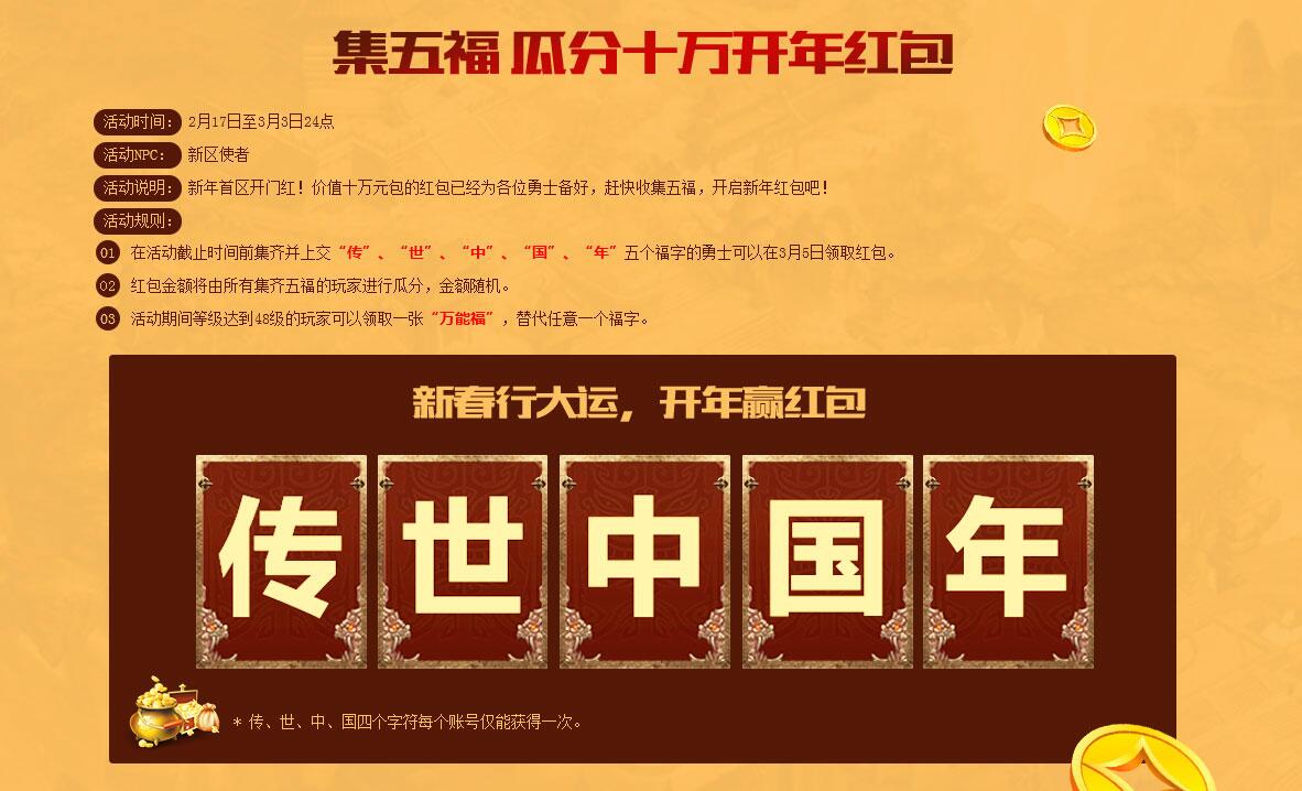 盛大游戏旗下经典PK网游《传奇世界》开启新年首区,铁血九区“天长地久”、十区“十全十美”今日14:00火爆开启!开年首区将携全新版本“行会风云”,为广大玩家奉上诸多惊喜。全新行会风云版本伴随新区上线;老友回归账号鉴定,领取绝版限量封号;集五福,抢红包,十万元宝大红包等你来抢,诸多新春惊喜尽在铁血新区! 新版本 行会风云震撼来袭 在今日开放的铁血九区、十区中,万众瞩目的全新版本“行会风云”终于与广大玩家见面。全新行会领地地图“九曜仙岛”仙灵降世,通灵塔内境开启,四海英雄汇聚聚义厅,开启崭新行会篇章。中州行商任务、行会秘境、行会领地战等全新玩法为玩家带来崭新的行会功能体验,赶快集结兄弟,开启最激情的“兄弟”版本之旅! 新荣耀 领取新区绝版封号 本次新区开放,为传世老兵们准备了专属福利,参与账号鉴定,可以领取新区专属绝版封号。在官网活动页面进行账号鉴定,可以获得对应的凭证,在游戏中使用凭证可以兑换相应的奖励。账号鉴定结果分为尊享、荣耀、畅想传世账号三种,分别可在游戏中兑换“醉卧沙场君莫笑”、“久逢知己”和“铁骑丹心”封号,获得丰厚属性加成。此外,成功鉴定账号还可以获得月光宝盒,达到制定等级还可以领取大量绑定元宝。 集五福 瓜分十万开年红包 春节期间抢红包是否抢的不过瘾呢?《传奇世界》新年首区为广大传世勇士奉上十万元宝开年大红包。从新区开放起,截止至3月3日24时,在游戏中完成特定任务、击杀怪物和BOSS可以获得“传”、“世”、“中”、“国”、“年”五个福字。集齐五个福字的玩家可以在3月5日领取红包,十万元宝大红包将有所有集齐五福的玩家瓜分,金额随机。在活动期间等级达到48级的玩家可以获得一张“万能福”,替代任意一个字符。 《传奇世界》铁血新区开年巨献,行会风云版本今日上线。海量精彩福利奉上,全新行会玩法燃情上线,带来全新行会体验,绝版封号、开年红包助阵勇士奋战新区,今日14:00,我们在新区不见不散。 了解更多相关信息,请前往http://news.yzz.cn/ku/cqsj2/ |