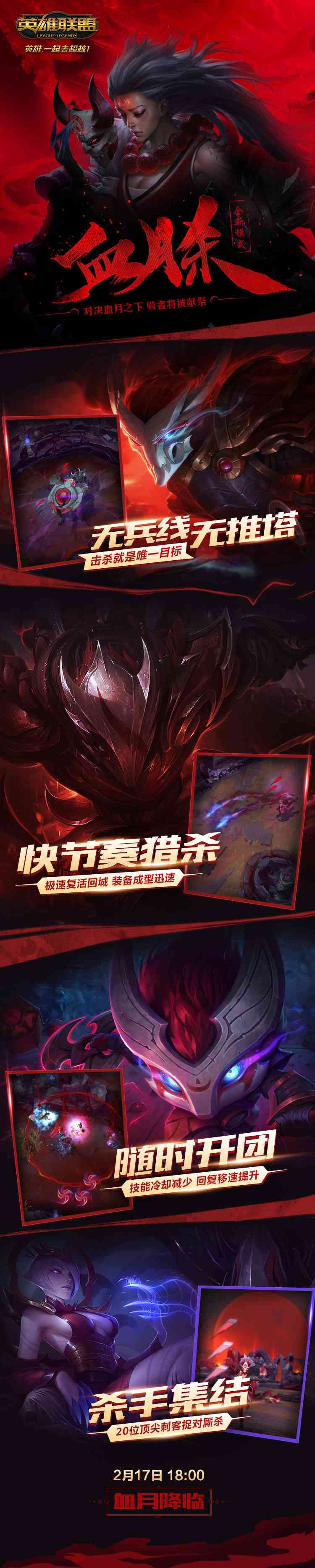 “天神召唤祭品之日,信徒寂夜杀戮之时。月影之下,愚者皆杀。” 2月17日,玩家们期盼已久的全新游戏模式——血月杀,正式开启。在这个5对5模式中,杀手们会在夜间出没,彼此交锋,狩猎恶魔、游魂以祭腥红之月。超爽快的对决快感,无兵线,无推塔,击杀是唯一的目标,超快节奏无限猎杀,极速复活回程,装备快速成型,技能冷却减少,回复移速提升,在血月氛围之下,尽情享受猎杀乐趣。 本次血月杀模式开放时间为2月17日18点-20日10点与2月24日18点-27日10点两个时段。召唤师等级大于等于10级的玩家们均可进入。 游戏中采用盲选模式,有20位英雄可供血月杀之用,包括:阿狸、阿卡丽、卡蜜尔、黛安娜、艾克、伊莉丝、伊芙琳、菲兹、卡萨丁、卡特琳娜、凯南、卡兹克、乐芙兰、李青、潘森、雷恩加尔、萨科、泰隆、亚索、劫。在这20名英雄中有10名英雄可以免费使用,包括:卡蜜尔、阿狸、阿卡丽、黛安娜、伊莉丝、卡特琳娜、凯南、李青、泰隆、亚索。 血月笼罩大地之时,恶魔和游魂统治着夜晚。峡谷之中没有了小兵的身影,防御塔也会随着时间从外塔开始逐层解除。恶魔先锋替代了峡谷先锋和小龙,游魂则徘徊在阴暗的峡谷野区里。玩家们通过击杀敌方召唤师(5分)、敌方野区游魂(3分)以及恶魔先锋(25分)积攒分数,率先达到350分的队伍将胜出。 游戏中召唤师峡谷受到腥红之月的诅咒,所有防御道具都会从商店移除,而每秒获得的金钱与经验大幅提升,复活时间与召唤师技能冷却时间将大大减少,并且所有参战英雄在脱战后,大招冷却将显著减少,移动速度、回蓝也将大幅提升。以往规则的束缚已不存在,一切改变,只为杀戮。而作为对强者的奖励,在不回城且没有死亡的情况下击败3个敌人(包括游魂),就会获得恶魔之力,变为隐形并回复生命,在持续时间内获得大量移动速度加成。但是造成伤害后就会脱离恶魔形态,伤害为目标最大生命值20%的真实伤害。 此次血月降临,又有四名英雄成为它的信徒。他们分别是烬、黛安娜、崔斯特以及泰隆。伴随着血月杀的开启,这四名英雄的全新“腥红之月”系列皮肤也将上架开售。在2月17日~2月23日还将限时推出“腥红之月 冉冉升起礼包”,以及“经典腥红之月礼包”,喜欢的玩家们千万不要错过。 此外,玩家们在赢下1局血月杀模式游戏后,可在8款经典腥红之月皮肤中任选1款七天体验皮肤领取,并可以抵扣为10元购买该皮肤。而如果能够赢得3局血月杀模式游戏,更可领取到“腥红之月”召唤师图标。 2月17日18点,血月杀全服开启,血影弥天,血色覆地。一往无前,唯战而矣! 关于腾讯游戏 腾讯游戏,全球领先的游戏开发和运营机构,国内最大的网络游戏社区。以“用心创造快乐”的理念,腾讯游戏通过在多个产品细分领域的耕耘以及对四大平台的打造,致力为玩家提供“值得信赖的”、“快乐的”和“专业的”互动娱乐体验。 腾讯游戏,用心创造快乐! 关于英雄联盟 《英雄联盟》(简称LOL)是由美国拳头游戏(Riot Games)开发、腾讯游戏代理运营的英雄对战MOBA竞技网游。游戏里拥有海量特色个性英雄,并拥有排位系统、天赋系统、符文系统等特色养成系统。自公测以来,获得了全球玩家的喜爱,目前,《英雄联盟》全球月活跃玩家已经突破1亿人。《英雄联盟》还致力于推动全球电子竞技的发展,除了联动各赛区发展职业联赛、打造电竞体系之外,每年还会举办“季中冠军赛”“全球总决赛”“All Star全明星赛”三大世界级赛事,获得了亿万玩家的喜爱,形成了自己独有的电子竞技文化。 |