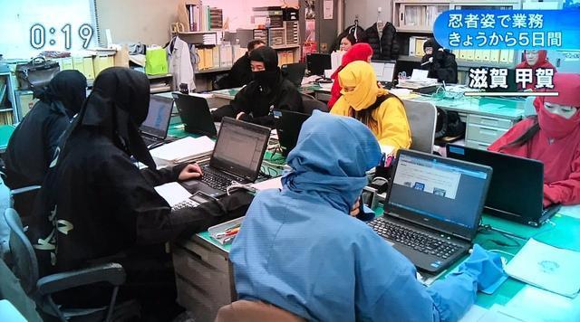 日本滋贺县甲贺市为宣传当地的忍者文化,规定全体机关公务员扮成忍者上班一周,画面十分羞耻…感觉最后大叔心里是崩溃的。 |