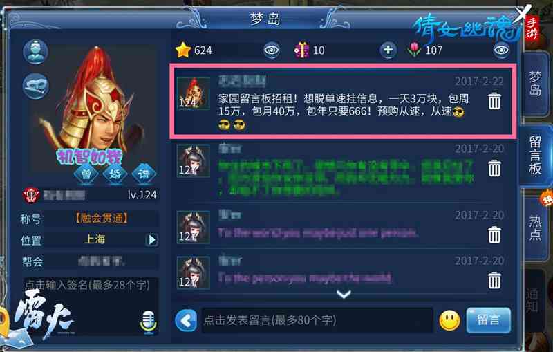 倩女幽魂手游社交玩法非常丰富,玩家在游戏之余,还可以打造属于自己的美好家园!玩家们不仅可以布置家园或跟爱侣同居,在家园新玩法上线后,还可以让亲密的朋友住在厢房常伴自己,没准也可以出租留言板赚“外快”哦!为让更多玩家享受游戏乐趣,倩女幽魂手游今天特地于安卓与苹果互通大区加开新服桃花朵朵,帮助玩家安家立业!那么,在倩女幽魂手游三界中,究竟有哪些经典家园值得一看?房客是否要交“租金”?留言板“招商”是否可行? 【经典家园赏析 让人流连忘返】 倩女幽魂手游家园玩法上线之后,玩家们纷纷买下了地契,获得了专属的家园,精心布置了起来。比如位于金陵城的杨洋家园,布局合理,景色宜人,让人流连忘返。参观别人家园,或者打扮自己的家园,已经成为一些玩家享受游戏的独特方式。当然,玩家决定和自己的侠侣同居,一起营造属于自己的爱的家园后,就要应对生活中的种种挑战了。 【同住屋檐下 经营家园要用心】 拥有共同家园后,玩家可以自制或采购家具来布置庭院,也可以烧制传家宝为家里增加灵气。家园新上线的留言板,可以方便的将访问家园的“流量”引导至自己的个人信息留言板!如果你的家园豪华,有大量访客观光,就可以像这位机智的玩家通过出租留言板来“赚钱”。 【家园玩法新功能 收租也能遇真爱】 无论你是单身还是拥有了TA,有了家园之后,在三界中就有了一个牵挂。其实,家园可不仅是简单地一个建筑养成玩法,在这个温馨的地方,还有很多深度的社交互动玩法。比如,在新上线的房客系统中,玩家可以邀请亲密的朋友住在厢房中,一起体验种菜收菜,制作家具的乐趣。长期的交往之后,没准还可以和租客谈谈情说说爱,说不定哪天租客就不用交“房租”,睡主卧了呢。 【新服再开启 入驻三界有福利】 倩女幽魂手游玩家众多,越来越多的玩家想要在倩女幽魂手游三界中安家立业。为了让更多玩家在今后的日子里,家园中遇到自己的美好爱情,倩女手游今日特地在安卓与苹果互通大区浮生记,加开新服桃花朵朵。开服更送超多福利,首充1元就有杨洋同款灵兽虎咪,还有超多社交玩法帮助你找到心中的TA,在三界中安家的日子不远了! 新一代国民手游《倩女幽魂》是电视剧《微微一笑很倾城》虚拟世界架构方《新倩女幽魂》的官方手游,拥有端游级唯美画风与人设,传承经典玩法,男神杨洋倾力推荐!家园房客系统大升级,360位色相自定义时装颜色,出家还俗随心玩,海量更新敬请期待! 了解更多相关信息,请前往http://qn.yzz.cn/sy/ |