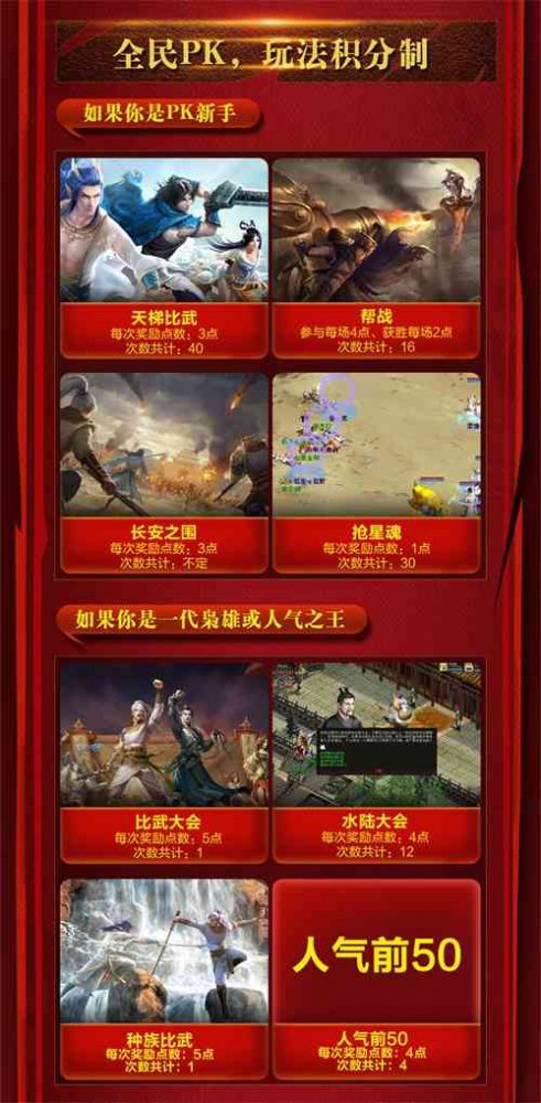 群雄齐聚一较高低,天榜荣誉孰能摘取!《大话西游2经典版》2017全民PK季火热激战中,今日起至3月31日,全PK玩法等你参与,海量福利大放送!无论你是PK新手,还是一代枭雄,在这里,都可以找到属于你的舞台,斩获趣味PK勋章,赢取个性化永久称谓、宝石、仙器、召唤兽高级技能以及珍稀年兽手办、鎏金宝鉴、2017玩家嘉年华入场券! 全PK玩法积分制 荣誉勋章孰能摘取 今日起至3月31日,《大话西游2经典版》2017全民PK季火热激战中,全PK玩法等你参与,海量福利大放送!其中,天梯比武每周周一、周日开启,帮战每周周五、周六开启,水陆大会每周周二开启,比武大会将于3月18日、3月19日开启,抢星魂每日均可参与,长安之围详情可到长安(389,38)处咨询NPC记室参军。 活动期间,天梯比武以及水路大会的亮点数据将以PK勋章的形式记录在风云录之中,玩家满足要求即可获得万兽之王、嗜血狂魔、控制之王、杀人如麻、起死回生、岿然不动、控制之王、夺命尖刀等PK勋章,活动结束后,名号前20名玩家将获得时效称谓奖励! 全民福利零门槛 鎏金宝鉴、珍稀年手办等你领 活动期间,诸位玩家参与PK季玩法均可获得天榜积分,使用25点积分可进行随机抽奖,有几率获得2017玩家嘉年华入场券、2016鎏金宝鉴、珍稀年手办、仙器、宝石、召唤兽高级技能等丰厚奖励! 根据积分生成天榜排行榜,4月1日后,单服排名前500的玩家可领取个性化永久称谓、海量经验、宝石精华以及鸡驴手偶等丰厚奖励!此外,在排行榜中点击“赞”按钮可支持除自己以外的积分榜玩家,每周单服被赞次数前50的玩家(每周四结算),可以获得额外抽奖机会,有几率获得宝石、仙器等奖励! 了解更多相关信息,请前往http://xy2.yzz.cn/ |