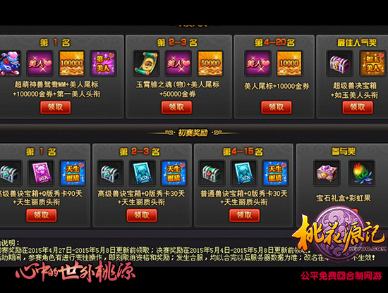 目前桃花美人大赛正在如火如荼地举行,小伙伴们是否已经为你心目当中的她投了票呢?正所谓群众的眼睛是雪亮的,相信大家共同选举出来的“美人”才是真正的“桃花美人”,下面就来为大家盘点一下历届的“桃花美人”大赛吧! 去年的桃花美人冠军奖励可谓是异常丰厚,不光有尾标、头衔等非常酷炫的奖励,还有巨额金券以及人见人爱的神兽-孙小妹。亚军和季军也依然有孙小妹之魂。美女配小妹,是不是锦上添花! 前年的大赛奖励也不差噢,冠军依旧是美人尾标和头像,还送自带浪漫主义气息的超萌神兽鸳鸯MM,亚军和季军则是另一只非常抢手的神兽-玉霄骓的魂。各位是不是也有所心动了呢?快去看看本届有哪些豪华奖励吧! 好了,欣赏完了历届的桃花美人,大家也该把焦点回看到本届赛事上了,究竟今年的冠军会花落谁家呢?让我们拭目以待吧! 【关于桃花源记】 《桃花源记》是由深圳淘乐网络研发运营的公平免费回合制网游。千古名篇唤醒每位玩家“心中的世外桃源”! 极致细腻画面,还原桃源仙境;无商城公平交易系统,实现人人平等;多重声望与货币寄售系统,真正天道酬勤!更有百科全书式全系统玩法与丰富的个性休闲设置!立足公平游戏世界,打造玩家心中的世外桃源! 了解更多相关信息,请前往http://thyj.yzz.cn/ |